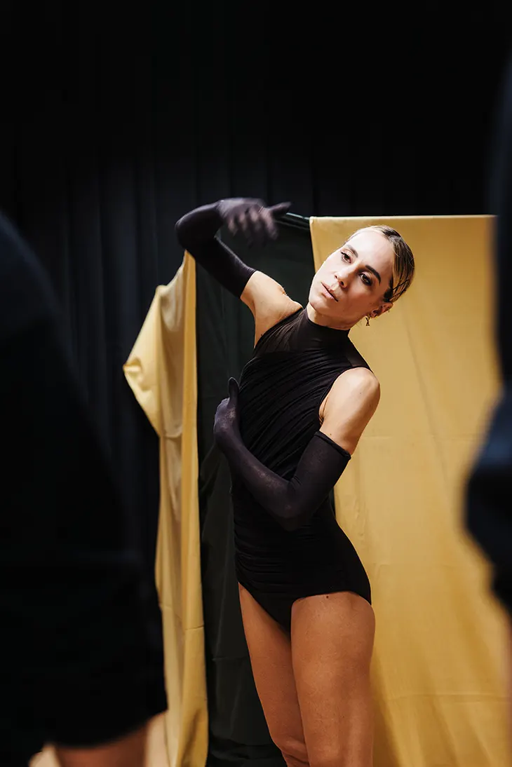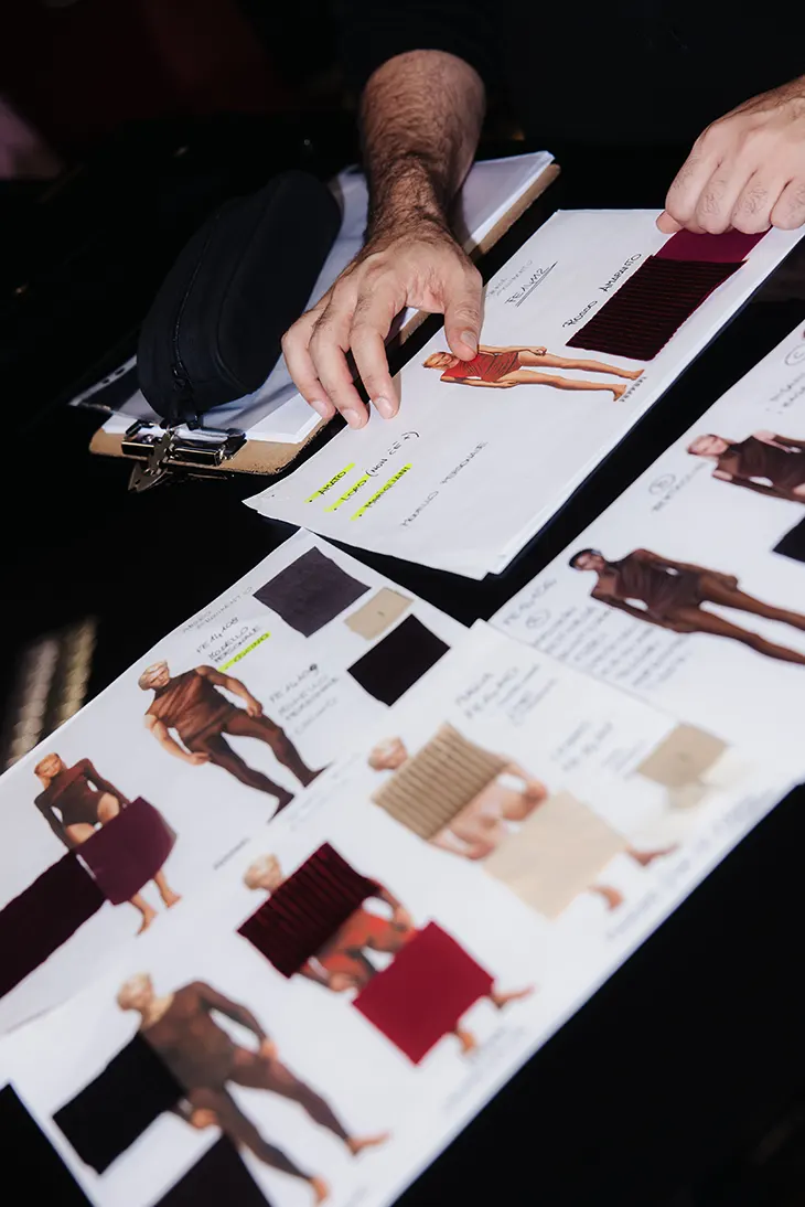 For the female dancers, the foundation is formed by draped bodysuits in jersey, cashmere, and stretch nylon tulle with a soft, silky feel. Color moves through “purebred,” amaranth, and nude tones, chosen to register as temperature and vibration under stage light. These bases are wrapped in lycra and stretch jersey, alternating matte and glossy finishes to sharpen contrast and emphasize the choreography’s internal oppositions.