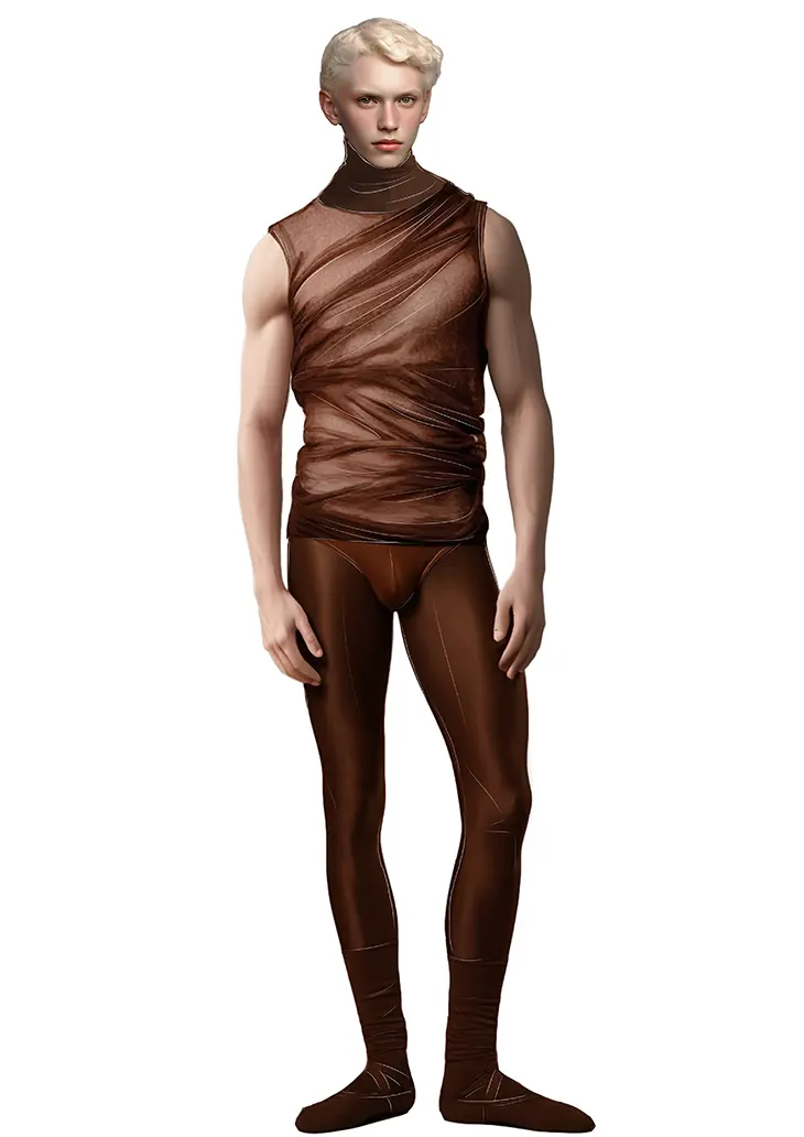 The construction aims for a silhouette that reads as both sculpted and alive. Instead of relying on ornament, the garments use surface and cut to register energy: how a shoulder opens, how a torso twists, how a leg line extends and returns.