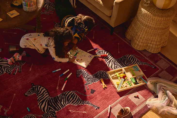 Imaginarium moves beyond primary palettes into softer tones, nostalgic heritage motifs, and storytelling. The collection is meant to create rooms that feel safe and inspiring, where children can be children and parents do not have to choose between aesthetics and sanity. In the broader context of home, this is where Ruggable’s model becomes especially disruptive: the rug is no longer a fragile finishing touch, it is a functional surface that can still carry taste.