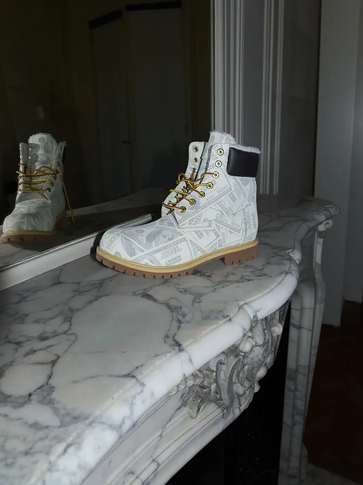 Accessories extend the collection with a wide range of items that carry the same graphic focus. Six-panel caps and a silk scarf introduce lighter elements, while a backpack offers a functional option within the same visual system. The Everlast Heavy Bag and Everlast 1910 Pro Boxing Gloves arrive in hairy suede, adding texture and weight to the accessories lineup. Footwear includes the Timberland six-inch Premium Waterproof Boot, updated with the dollar bill motif and shearling detailing, aligning with the outerwear pieces.