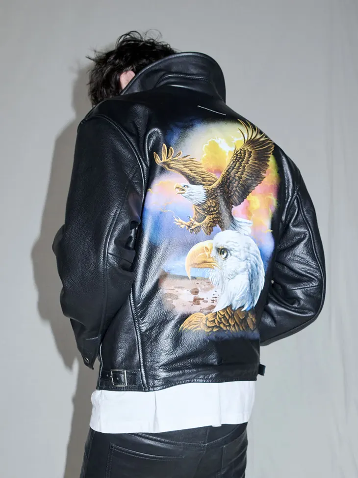 Outerwear leads the lineup with a zip-up Schott Leather Jacket featuring a detailed image of an eagle flying across a sunset. The piece anchors the collection through scale and surface treatment. Hooded Shearling Bomber Jackets arrive in deep maroon and an all-over $100 USD bill print, each designed with a removable hood. Denim Trucker Jackets appear in white and blue selvedge with a distressed finish. Stadium Jackets introduce a dual-design format, while zip-up hooded jackets extend the offering with a more direct approach to layering.