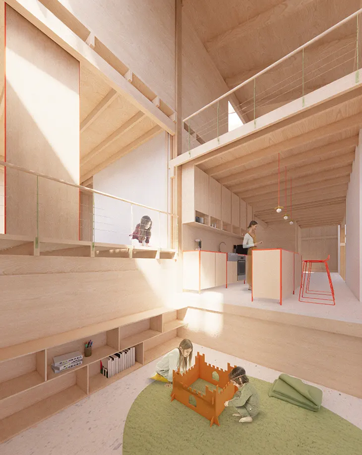 This position is especially clear in Under ONE Roof, an award-winning individual competition proposal developed for three vulnerable single-mother families. Rather than treating affordability as a purely financial issue, the project addresses it as a spatial and social condition. The proposal brings three households into a single wood-framed volume, using timber construction to reduce cost, improve sustainable performance, and create a calm domestic atmosphere.