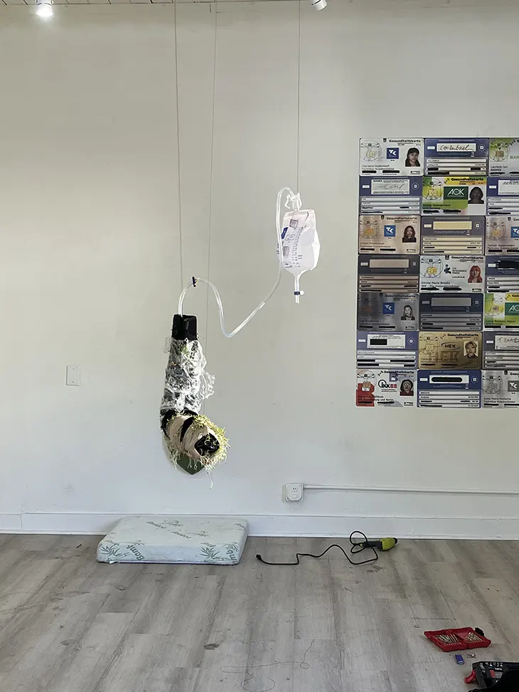Budding Itch integrates living botanical elements into modified medical apparatuses, transforming clinical devices into evolving ecological structures. Plant growth gradually intertwines with mechanical surfaces, altering their function over time. The exhibition included artists such as Young Joon Kwak, whose work has been exhibited at institutions including the Hammer Museum and referenced in publications such as Artforum and The New York Times, situating I-body within an active and visible contemporary art programming environment.
