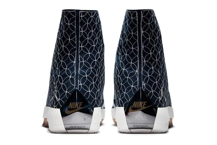 Sashiko stitching runs across the zippered cover in an interlocking circular pattern, creating a surface defined by repetition and precision. This approach connects the shoe to a specific cultural reference without relying on overt graphic elements. The denim and stitching work together to define the identity of the upper.