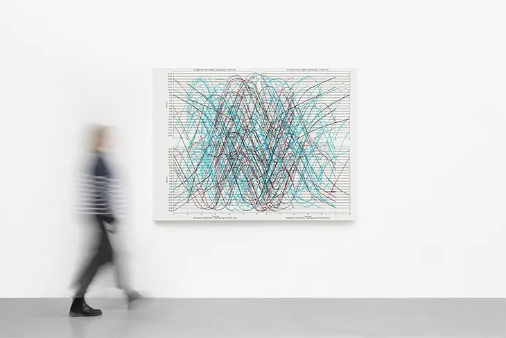 At the heart of the exhibition is Pulse (2025), a series that transforms the “Earth’s Pulse”. a faint, recurring seismic signal, into hybrid compositions where scientific record and human gesture collide. Allora & Calzadilla’s interventions on seismographic printouts evoke not only the mechanics of measurement but also the ineffable qualities of intuition, memory, and corporeal rhythm. Here, the artists challenge the authority of objective systems, inviting viewers to consider what remains irreducible to data: the subtle, embodied ways we attune to planetary and personal cycles.