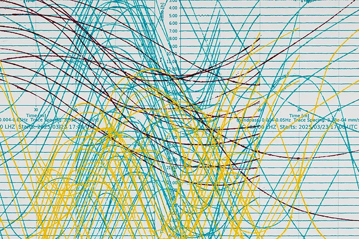 Pulse translates a highly technical seismic signal into something deeply somatic and affective. How did you negotiate the tension between scientific legibility and the risk of aestheticizing data, and where did you decide that “feeling” should override “accuracy”? – When we looked at the seismographs, tools that register the planet’s rhythms, we immediately thought of electrocardiograms, which register our own. Drawing into the seismograms allowed us to surface what the data cannot hold: intuition, memory, and the body’s ways of sensing. We never set out to present the seismic data as a neutral fact; every measuring system has limits, it inevitably leaves things out. During a research trip for another work, Penumbra, we visited the tomb of Édouard Glissant in Martinique, where the inscription reads: “Nothing is true, everything is alive.” That sentiment captures our approach: accuracy matters, but it cannot speak fully to the entanglement between human gesture and planetary rhythm.