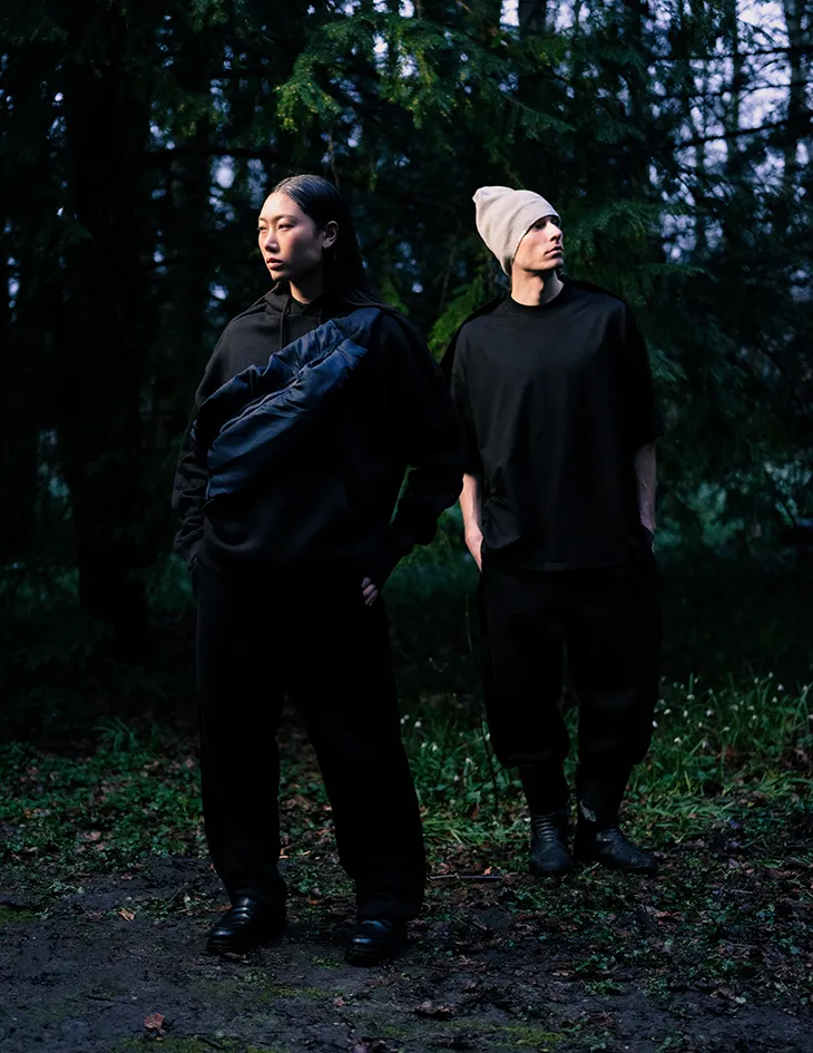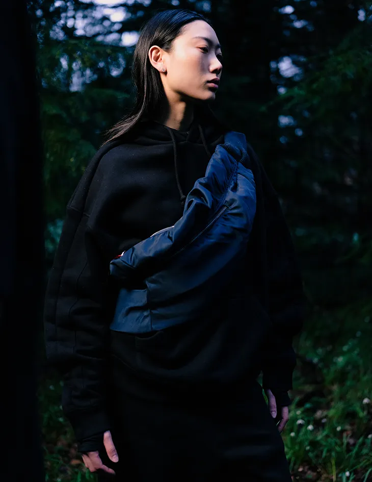 The project engages directly with Alpha Industries’ material history. Flight nylon, bomber constructions, and utilitarian detailing form the foundation of the collection. These elements are taken apart and rebuilt into new forms, with seams left visible. This method shifts focus away from standard production and toward a system shaped by available resources. Each piece carries traces of its origin, keeping the garment’s past present within its new configuration.