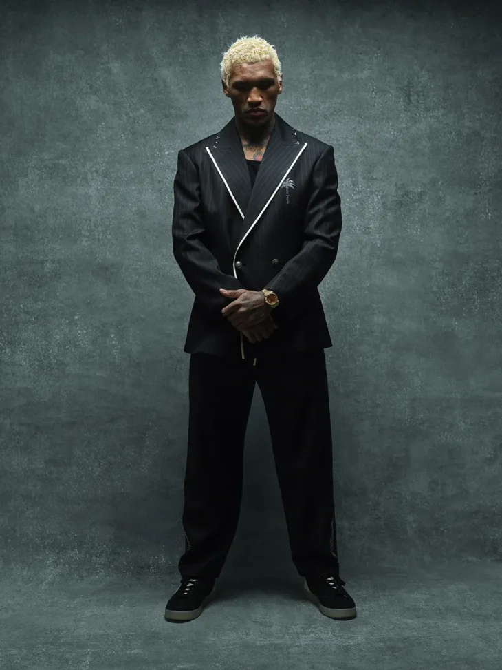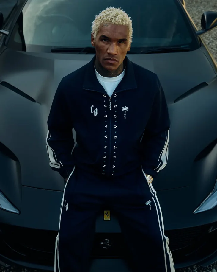Beyond the ring, Palm Angels extends the collaboration into two tailored looks for Benn’s press appearances. A double-breasted blazer with pleated trousers appears in a refined pinstripe, marked by a studded palm logo at the chest and Benn’s monogram at the back. A second look reworks the brand’s tracksuit, previewing Fall Winter 2026 through custom embellishments and crystal detailing tied directly to Benn’s visual identity.