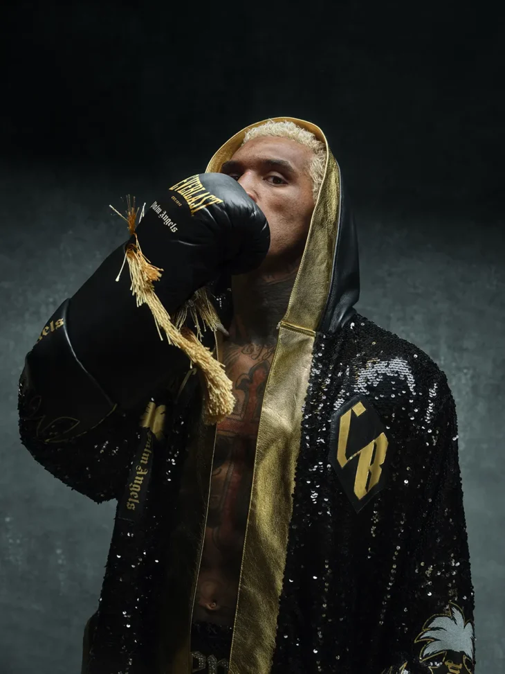 The robe anchors the look. Constructed through a mix of printed paillettes, nappa leather, and Swarovski crystals, it holds a deliberate tension between craft and spectacle. The surface carries weight without excess, built to register under stadium lighting while maintaining a sense of discipline in form. The piece positions the ringwalk as a staged entrance, where movement and material work together with intent.
