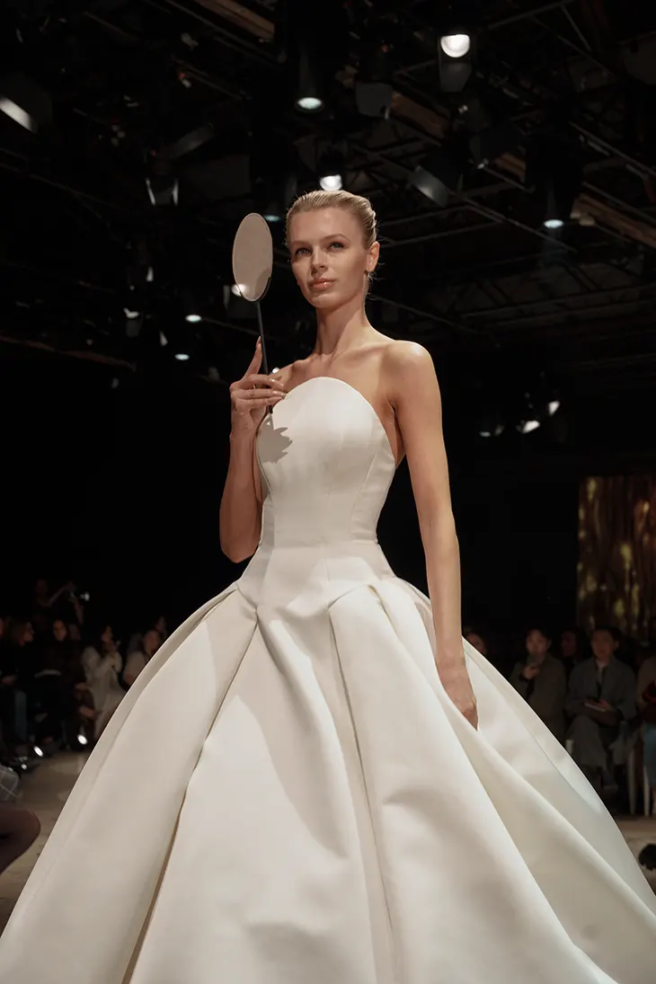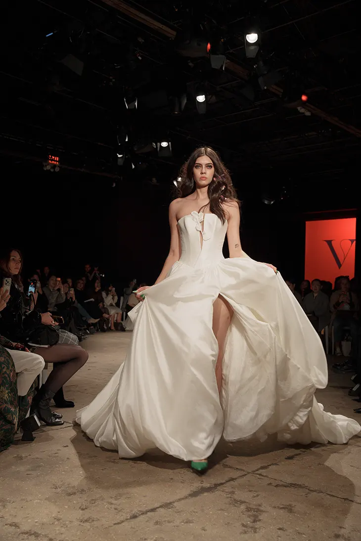 V / Veronica Di Santo focuses on fashion-conscious clients who approach bridalwear as an extension of personal style. The collection reflects a shift in how customers engage with brands, with digital discovery shaping initial contact. Designs respond to this context through a balance of clean lines and softer forms, where structure and movement define each piece. Fabrics emphasize lightness and transparency, referencing ripples and reflections that influence how garments move. The range includes gowns, separates, and dresses designed to cover ceremony and after-party moments, with pricing positioned between 4,000 and 7,000 dollars.