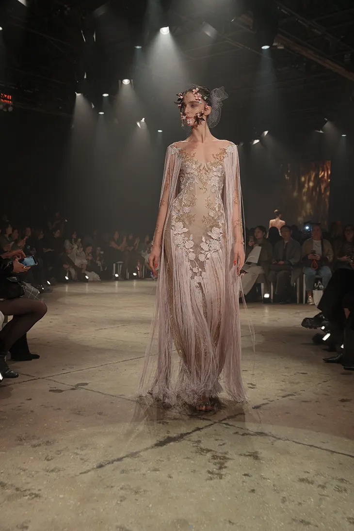 Ines Di Santo returns to New York Bridal Fashion Week for Spring 2027 with a couture collection shaped by references to Claude Monet. The designs focus on texture, drawing from the layered surfaces found in his paintings. The palette stays within white and ivory, where contrast develops through surface treatment, embellishment, and layering.