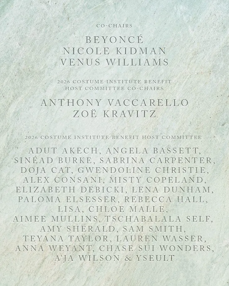 The 2026 Met Gala will mark the return of Beyoncé as co-chair, joined by Nicole Kidman and Venus Williams. Their roles shape the structure of the event, guiding both its presentation and its public narrative. The theme, “Costume Art,” directs attention toward fashion as a form tied to art history, setting the framework for the evening’s visual direction and guest interpretation.