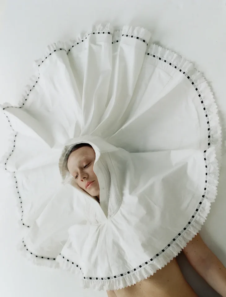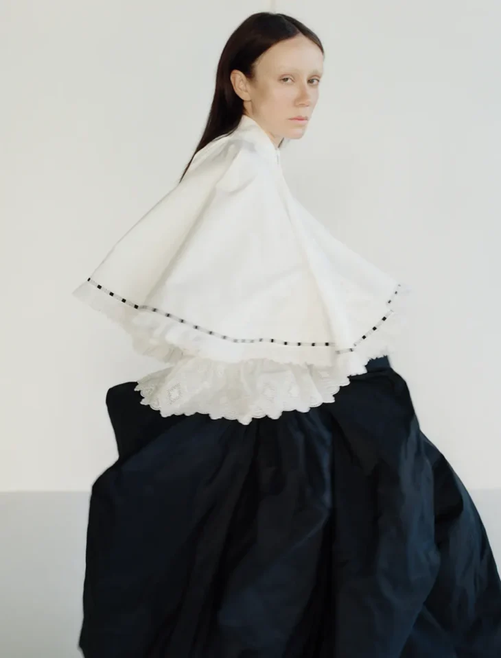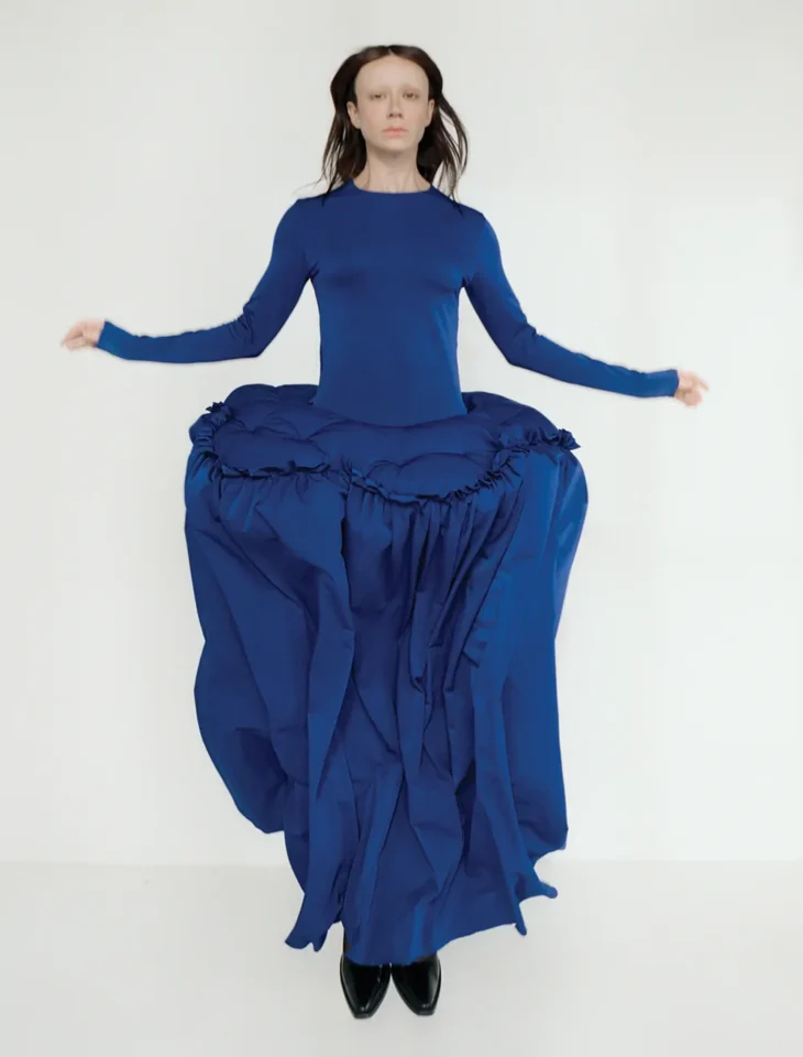 Garments follow this rhythm. They respond to motion rather than dictate it, shifting with each gesture and settling into new shapes as the body moves. Fabric holds tension, then releases it. Nothing remains fixed. The result is a sequence of silhouettes that feel in constant transition, shaped as much by posture as by construction.