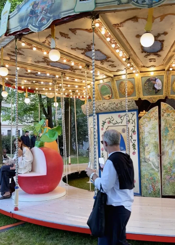 One project unfolded in a public park. A carousel, built in collaboration with a young artist, placed within a setting that felt deliberately innocent. Bright colors, soft shapes, a sense of play. An orchestra performed nearby, using vegetables as instruments. The sound, the visuals, the atmosphere, everything worked to create a moment that felt light, almost detached from reality. It was beautiful. It was engaging. It was easy to photograph and easy to share. And yet, the intention felt clear. To create a space where the brand’s presence shifts away from its production model, where the focus turns toward experience, toward emotion, toward something that feels harmless.