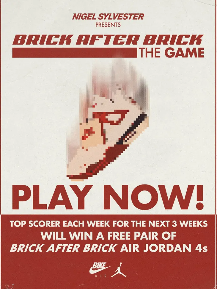 The installation extends into a digital format through the Brick After Brick mobile game. Inspired by Tetris, the game invites users to engage with the same themes presented in the physical work. Players access the game through both desktop and mobile devices, where performance depends on consistency and timing. Over the next three weeks, the highest scorer each week will receive a free pair of the Nigel Sylvester x Air Jordan 4 “Brick After Brick” ahead of its official release. The game also directs users to Nigel Sylvester website, where they can follow updates tied to the collaboration.