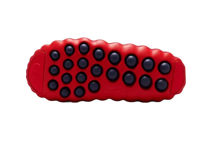 Inside the shoe, the footbed introduces circular pressure nodes positioned to stimulate the sole. These nodes replace the classic orange elements from earlier releases with midnight navy versions that match the darker tones of the outsole. The outsole follows the same tonal direction with dark navy traction pods that support stability. Red tones on the upper meet navy elements below, creating a clear and controlled contrast.