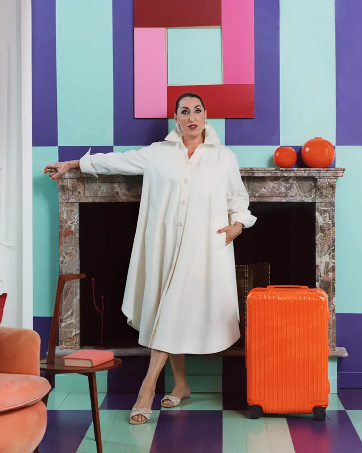 The campaign presents this direction through a setting that amplifies color and form. Spanish actress Rossy de Palma appears within a highly styled interior filled with curated objects, where the suitcases and bags integrate directly into the space.