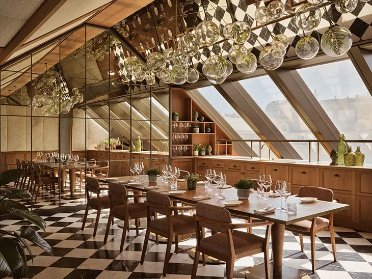 Dining at Rosewood Vienna takes place within spaces that extend the architectural narrative of the building. Neue Hoheit Restaurant and Bar sits above the city, offering wide views across Vienna while maintaining a controlled interior environment. The menu focuses on Austrian cuisine, interpreted through seasonal ingredients and a clear approach to preparation.