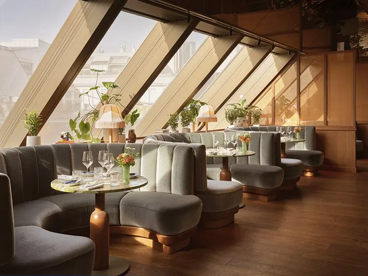 The rooftop setting introduces a different pace as the day progresses, shifting from structured dining to a more relaxed evening atmosphere. The space adapts through light and use, maintaining its identity while accommodating different moments. Each element, from layout to service, contributes to a cohesive experience that connects back to the overall design of the hotel.