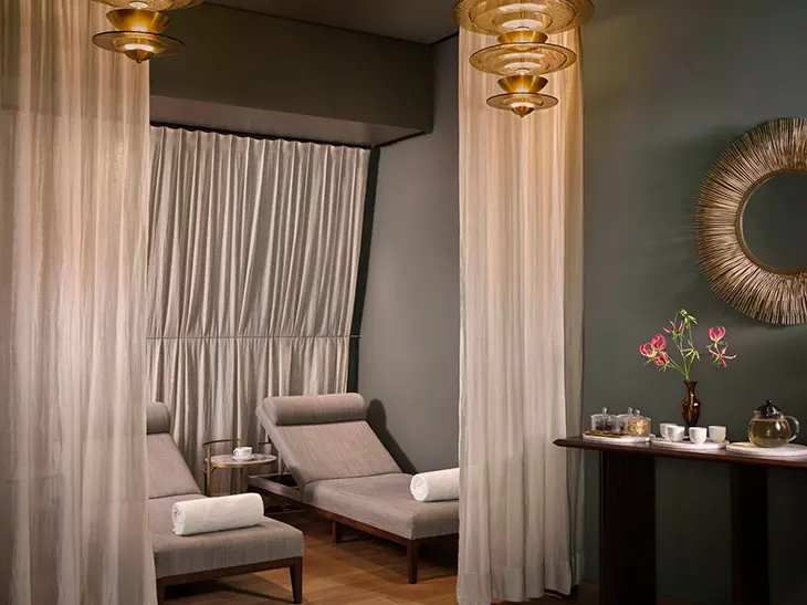 Asaya Spa introduces a quieter, more contained atmosphere within the hotel. The design focuses on controlled environments, using light, proportion, and material to establish a sense of calm. Spaces transition gradually, guiding guests through treatment areas, sauna, steam bath, and experiential showers.