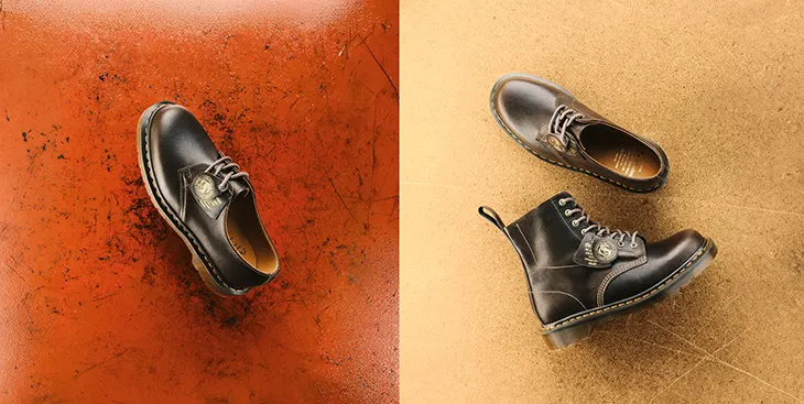 The construction follows the original approach. Goodyear welted, grounded on the signature sole with grooved pattern, the shoe carries double stitching and the familiar yellow welt detail. Antique gold eyelets and waxed round laces introduce a subtle adjustment to the oxford profile, while a special swing tag references the Cobbs Lane factory. Alongside the 1461, Dr. Martens extends the same material treatment to a limited 1460 boot, reinforcing the link between the two silhouettes. The release stays anchored in production methods that rely on precision and material integrity, presenting the 1461 as a form that continues through time without interruption.