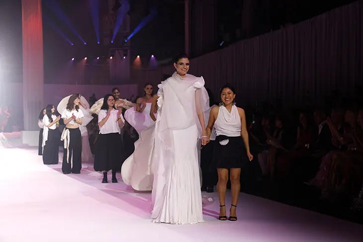 The evening opened with a segment dedicated to emerging talent. Students from IED Barcelona, LCI Barcelona, and ESDI presented 23 designs developed under Rolland’s mentorship through the Sculpted by Nature project. Using fabrics provided by Gratacós, the participants explored volume, structure, and organic forms. The pieces introduced sculptural silhouettes shaped through careful construction. This opening established a dialogue between established practice and new voices, placing education and exchange at the center of the event.
