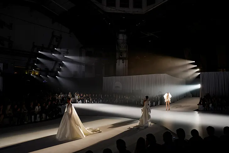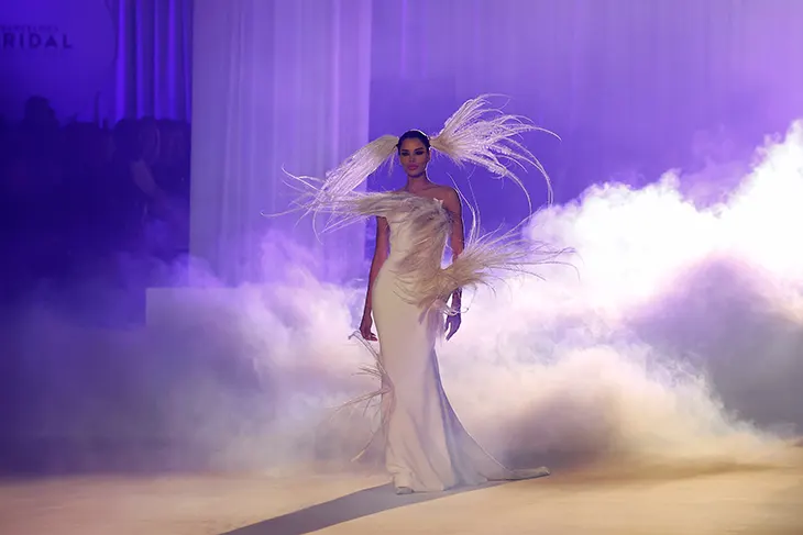 Stéphane Rolland presented Love for Peace at Barcelona Bridal Night during Barcelona Bridal Fashion Week 2026, marking his first fashion show in Spain. The event unfolded at Hall 8 of the Montjuïc venue, where the designer, together with artistic director Pierre Martinez, staged a performance that brought together couture, music, and spoken word. The presentation focused on a clear idea: fashion as a shared language tied to life, love, and the transmission of knowledge across generations.