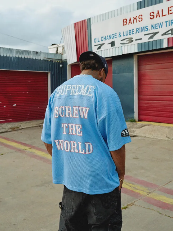 Supreme builds this collection around that legacy, working directly with his estate. The lineup includes a Football Jersey, Hooded Sweatshirt, Sweatshort, Tee, 5-Panel, and a Bobblehead. Each piece draws from DJ Screw’s presence and the visual language tied to his work and community.