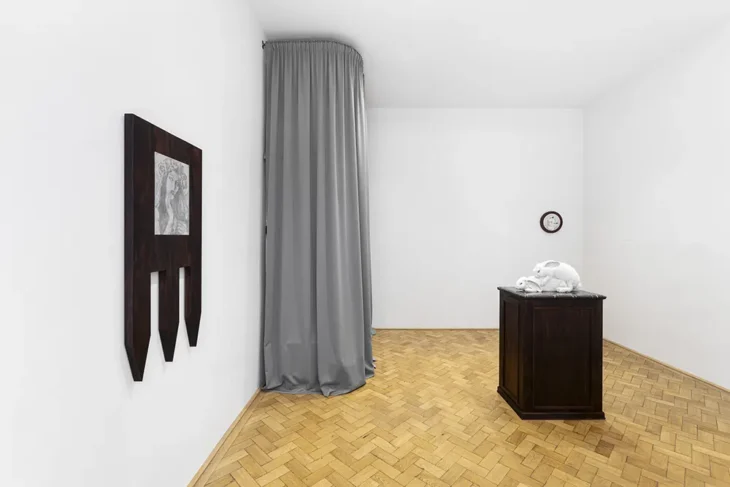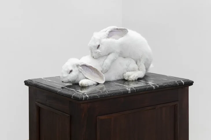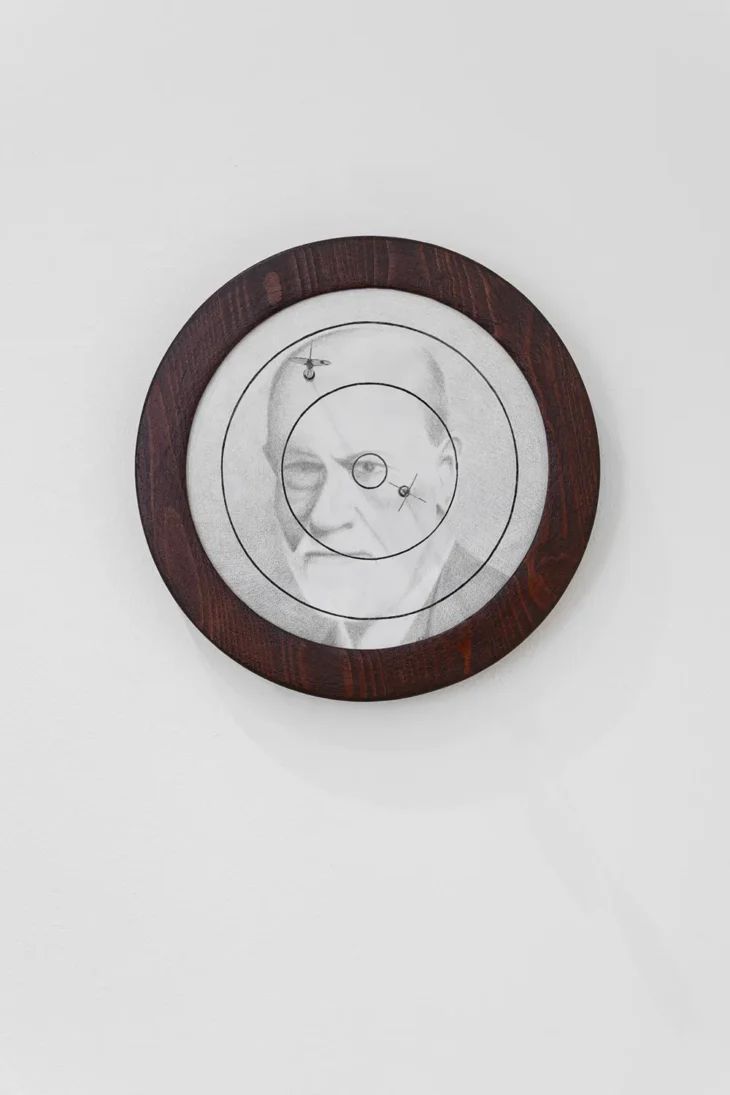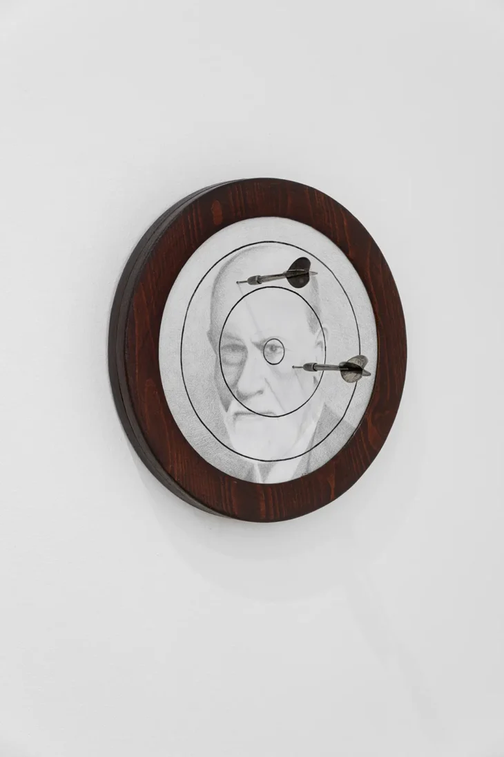The first encounter comes quickly. Two rabbits in a sexual position, placed at the entrance, immediate and unmistakable. The reference is clear, but the execution resists anything crude. It sits somewhere controlled, almost formal, stripping the act of spectacle and redirecting it toward something quieter, closer to origin than provocation. Nearby, Freud appears fixed to a dartboard, pierced with darts. The gesture reads in two directions at once. It carries a sense of arrival, a direct statement of presence within Vienna, but also signals a break, a shift toward maturity, a departure from boyhood as Ciurescu approaches thirty.