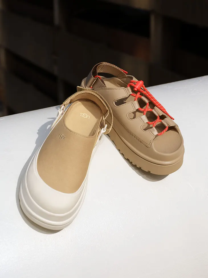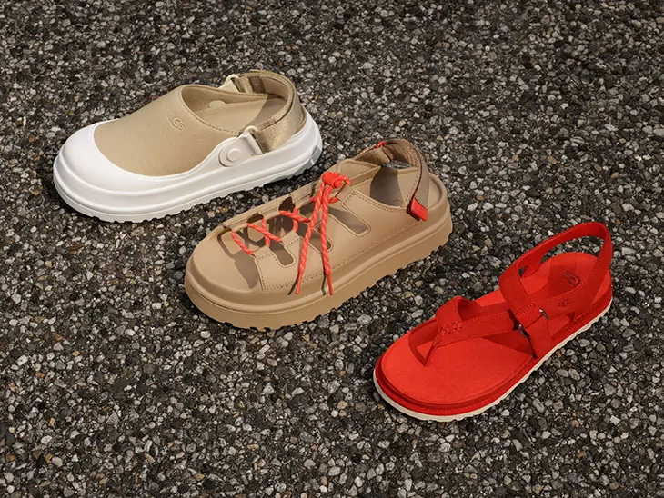 The release builds on established UGG forms while shifting them into a warm-weather context. The collection reworks known shapes through updated construction and material combinations, focusing on contrast across texture and tone.