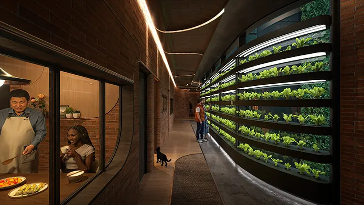 Mo began with a close study of natural morphologies, developing a strategy he calls “dissolving”: extending the historic facade’s two-dimensional ornamentation into three-dimensional spatial elements. The original brick-and-terracotta surface stratifies outward into planters, glazed recesses, and Y-shaped balconies through advanced 3D clay printing, complex geometries panelized, digitally fabricated, kiln-fired into terra cotta, and dry-mounted onto a new structural framework. Inside, Mo organized a six-story vertical farm through the central atrium, connecting an underground food court, shared kitchens on each residential floor, and a rooftop garden, treating food as a spatial and cultural connector capable of restoring collective belonging.