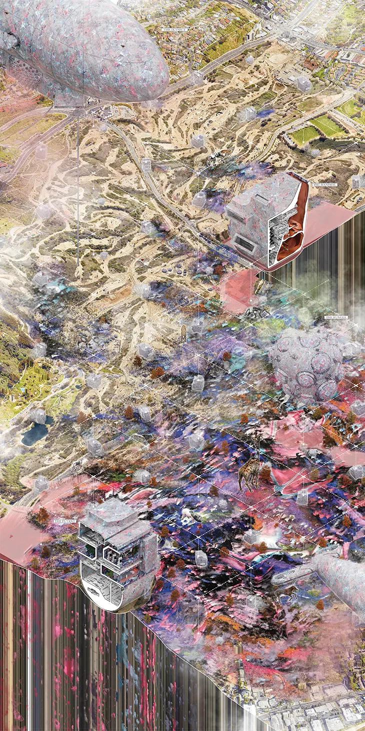 Rock and Roll, recently featured on Designboom, pushes Mo’s framework to its most radical conclusion. Developed with Chunyu Ma for the Inglewood Oil Field in Los Angeles, the project proposes autonomous architectural entities that drive ecological regeneration on a decommissioned industrial site without human control. At its origin is a pair of physical prototypes Mo conceived and built, the Rocker, a concrete-and-metal structure that extracts atmospheric moisture through condensers, and the Roller, a mobile seed-dispersal element driven by a double-pendulum mechanism Mo engineered for non-linear movement. These “Homunculi” are full-scale constructions, not renderings, demonstrating Mo’s commitment to testing speculative ideas through fabrication. The operational logic extends site-wide through four specialized incubators, animal, plant, fungal, and insect, each assigned a role within a closed-loop system of growth, decomposition, and redistribution that Mo structured as a single architecturally orchestrated ecological cycle.