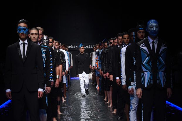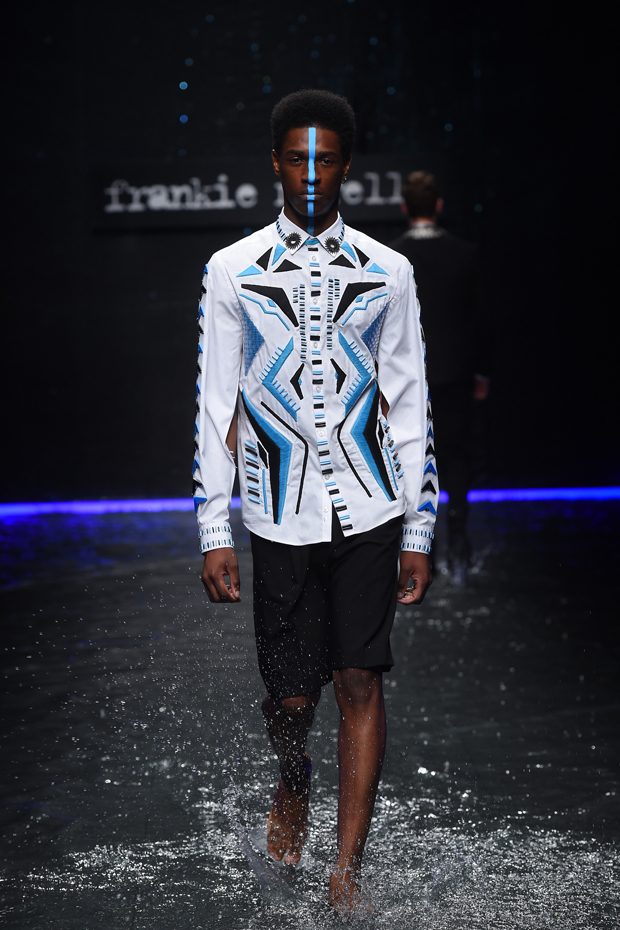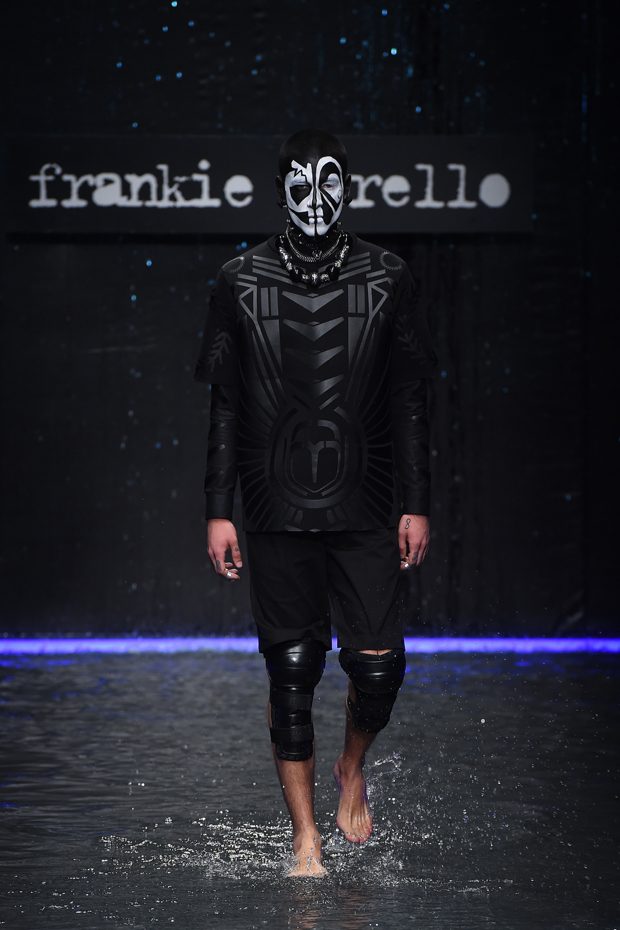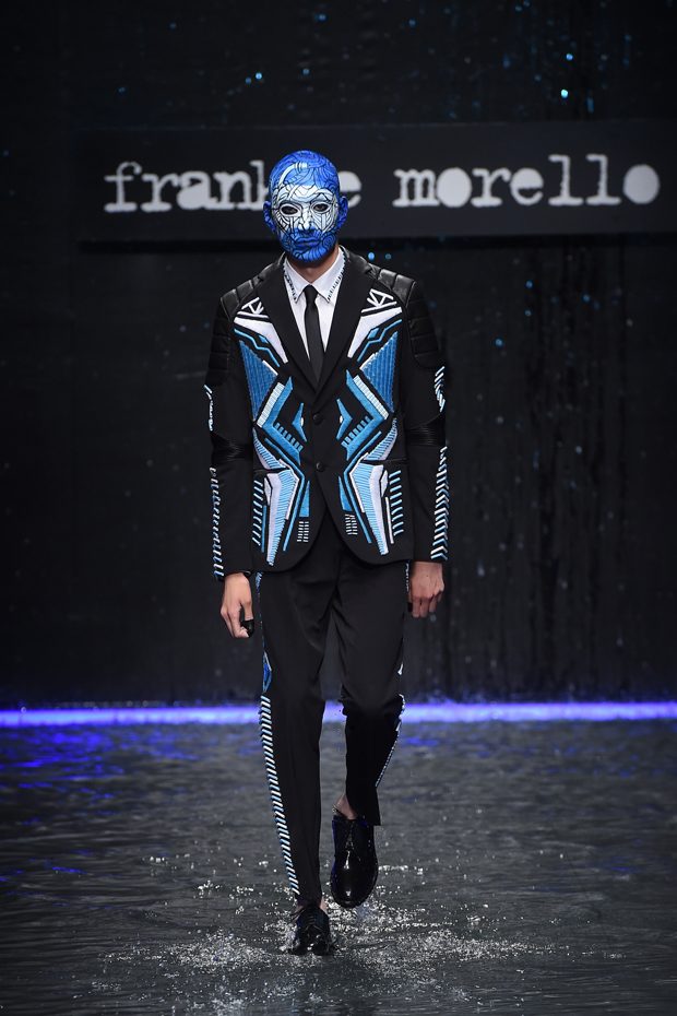 In the last part of the collection, #SpaceOcean, we introduce the world of abysses, where the only sources of light are given by the bioluminescence of almost alien-looking animals that point to a surreal world resumed on allover prints. Humanoid anatomical silhouettes are superimposed on technological elements and lead to the emergence of new hybrid forms of life, enabling us to enter into a mysterious vision, at the confines of reality and fantasy: welcome to Atlantis. The interpretation of this civilization is characterized by a tribal touch thanks to the use of technological materials such as cables and wires attached to handmade wire embroideries that recreate a geometric tribal appearance. – from Frankie Morello