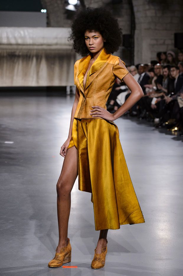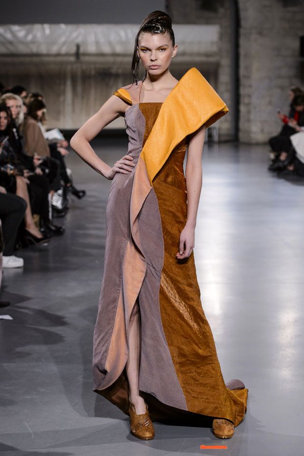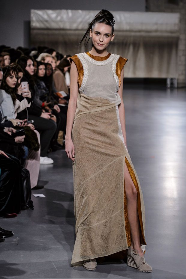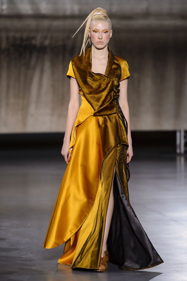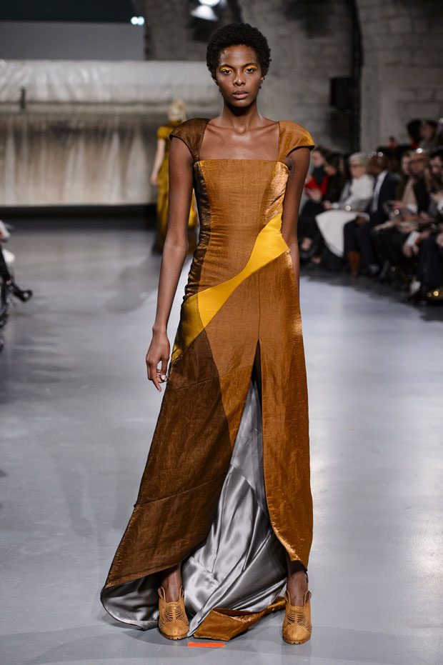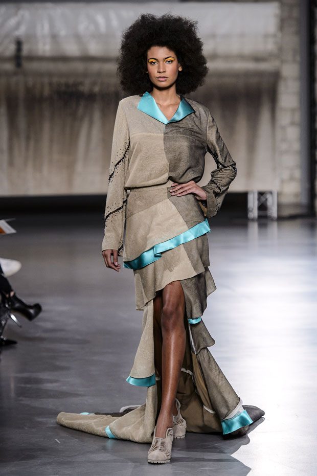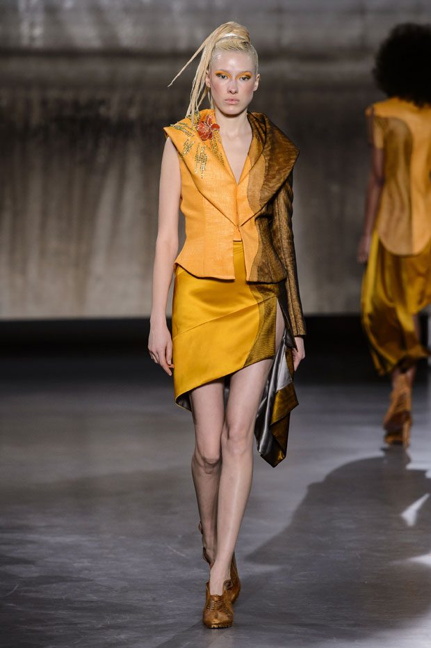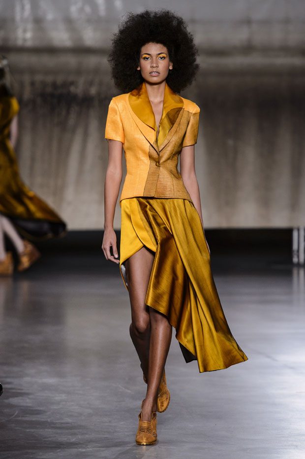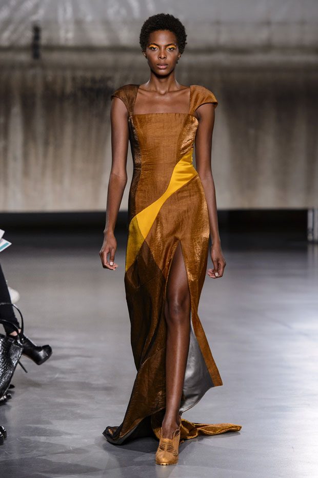 The warm hues of the desert dominate the spring-summer 2018 collection of the Montreal-based, Mexican-born designer. Images of scorched and cracked earth give way to the ripples of a heavy silk, evoking in their movements the changing waves of sand dunes. Guided by shifts in light and the slightest passing breeze, garments mutate and take on an ephemeral existence that lasts only until the next movement. The constant to and fro is framed by the passage of shadows of black silk tulle that envelop and consume the warm colors of the collection. A yellow jute, coarse and rough, juxtaposes the softness of a silk. The play of contrasts that characterizes Ortega’s work takes on its full meaning in a desert landscape; dark shadows bring freshness while a sparkling embroidery instantly reminds us of the glare of a blinding sun. Suddenly, a burst of bright color, like a desert flower springing up after the rain. From a distance, its contours are fuzzy, like a mirage, but closer, details become more precise. The glitter quickly disappears among the beige, yellow and golden surroundings, as the desert reclaims its rights. – from Antonio Ortega