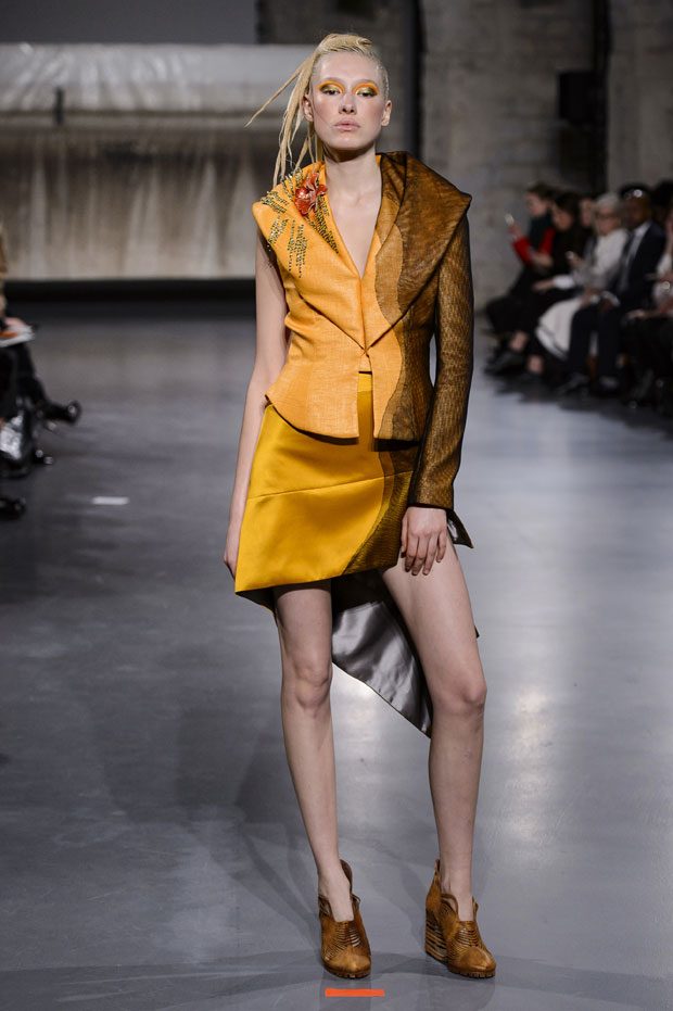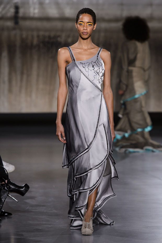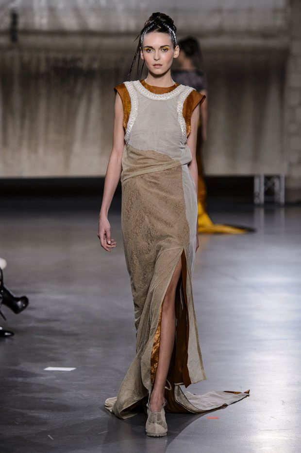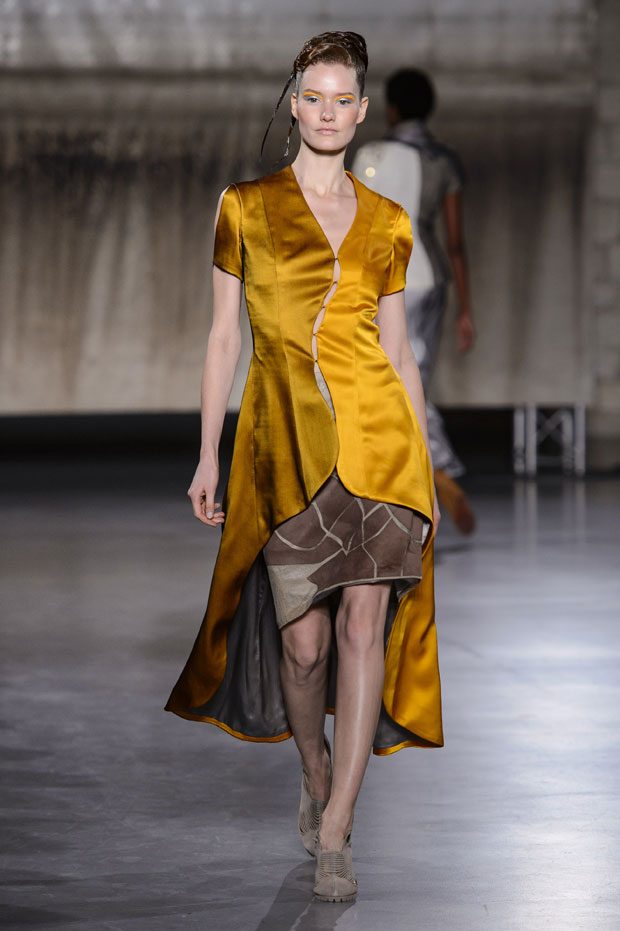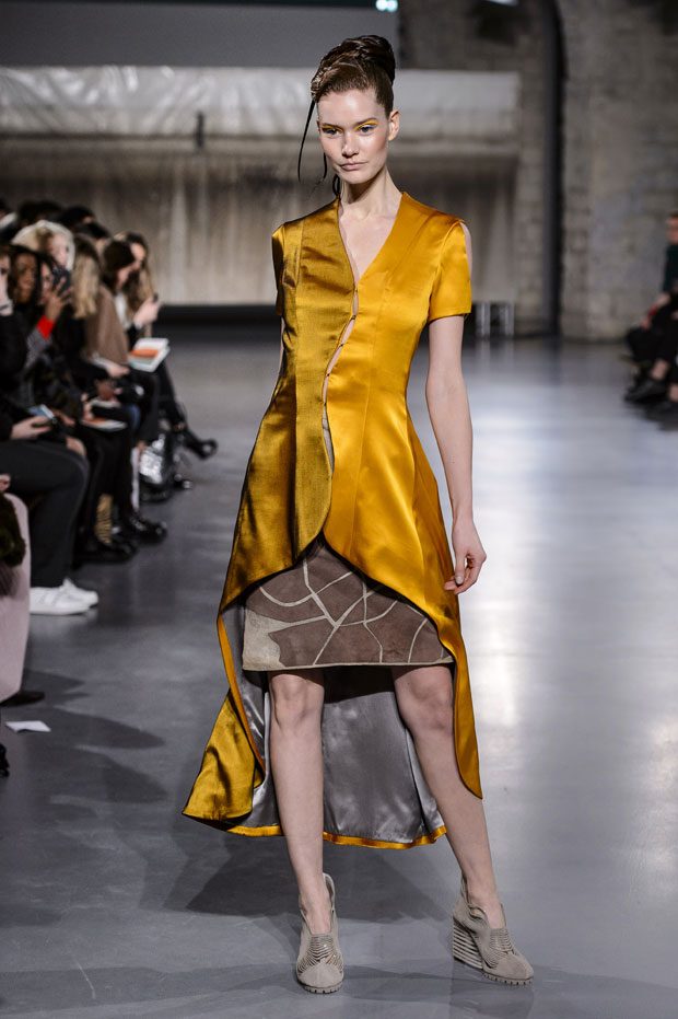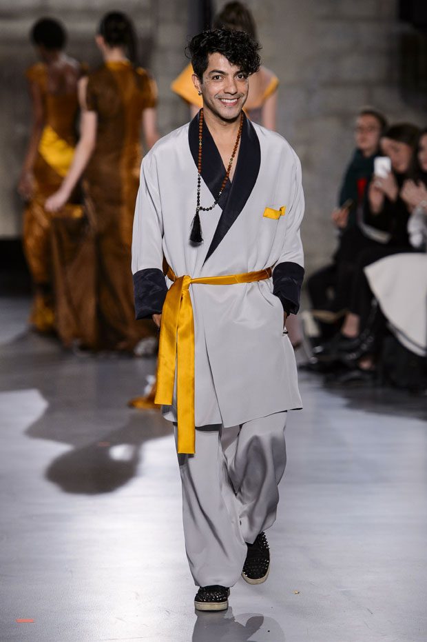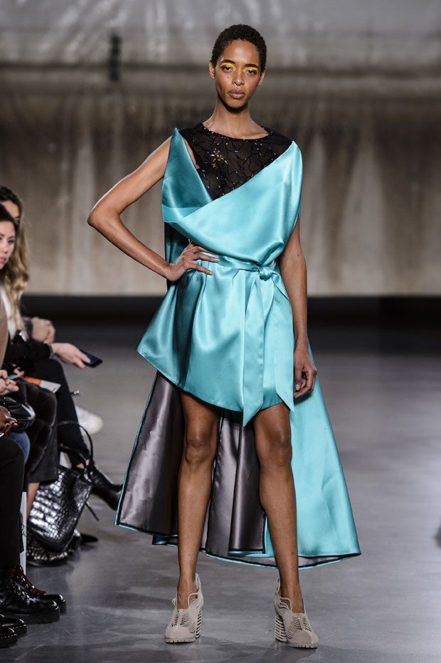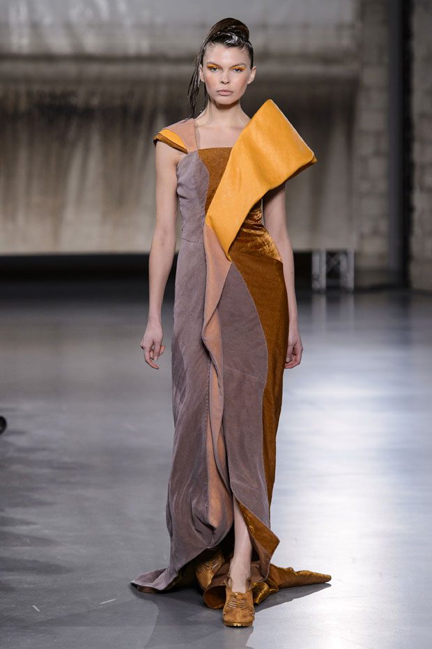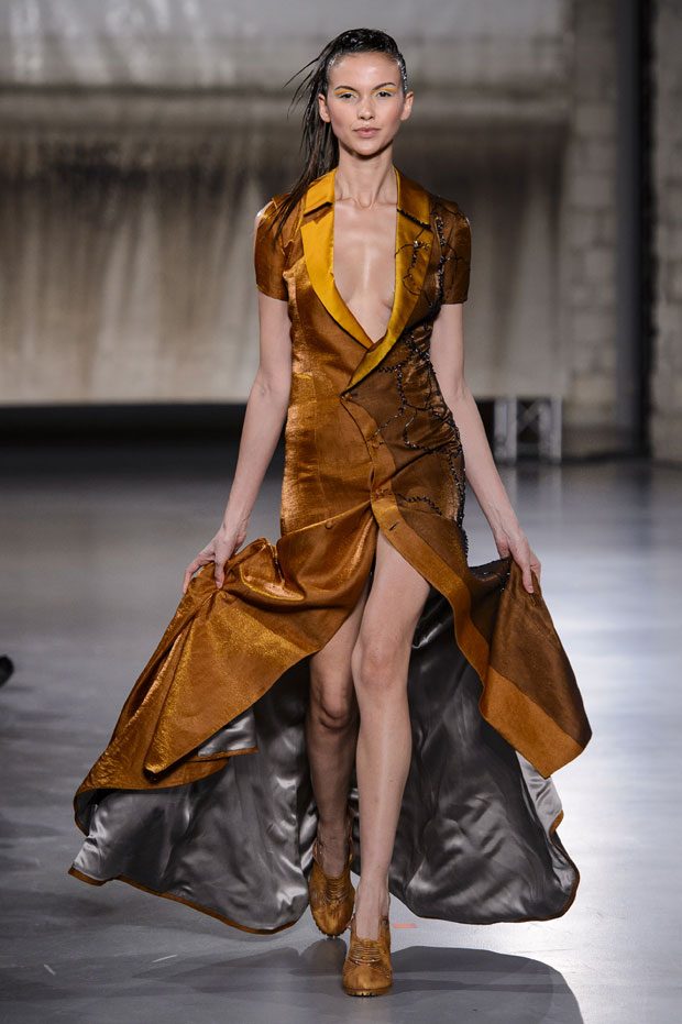 The warm hues of the desert dominate the spring-summer 2018 collection of the Montreal-based, Mexican-born designer. Images of scorched and cracked earth give way to the ripples of a heavy silk, evoking in their movements the changing waves of sand dunes. Guided by shifts in light and the slightest passing breeze, garments mutate and take on an ephemeral existence that lasts only until the next movement. The constant to and fro is framed by the passage of shadows of black silk tulle that envelop and consume the warm colors of the collection. A yellow jute, coarse and rough, juxtaposes the softness of a silk. The play of contrasts that characterizes Ortega’s work takes on its full meaning in a desert landscape; dark shadows bring freshness while a sparkling embroidery instantly reminds us of the glare of a blinding sun. Suddenly, a burst of bright color, like a desert flower springing up after the rain. From a distance, its contours are fuzzy, like a mirage, but closer, details become more precise. The glitter quickly disappears among the beige, yellow and golden surroundings, as the desert reclaims its rights. – from Antonio Ortega
