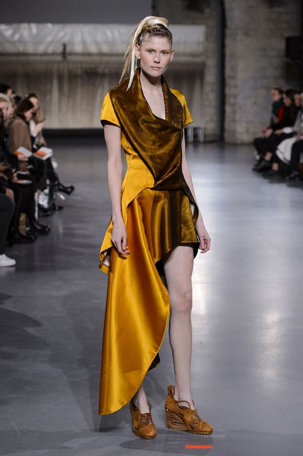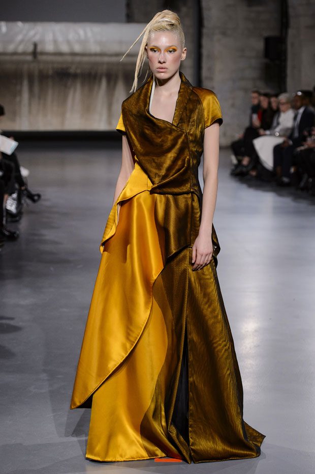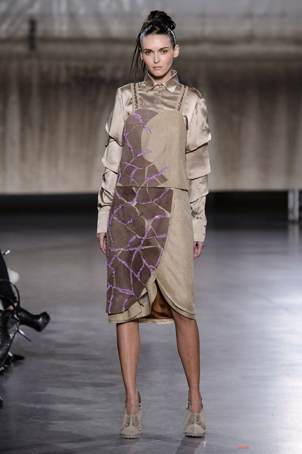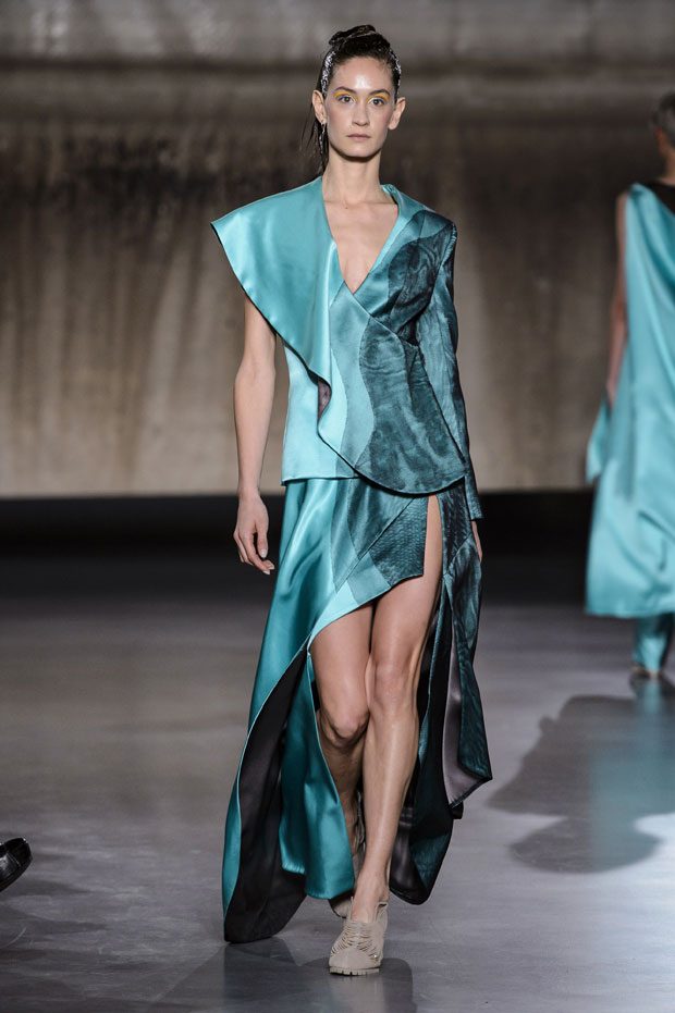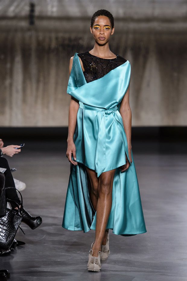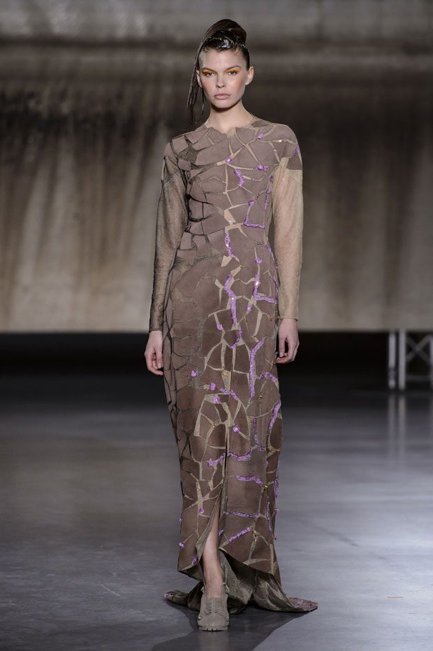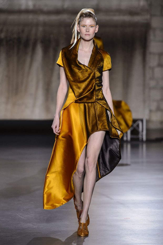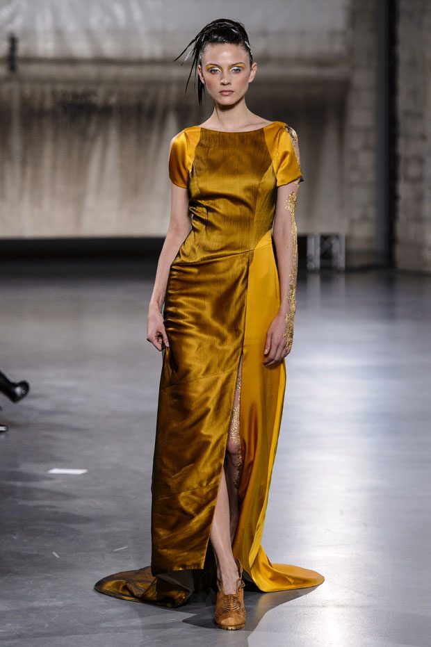 The warm hues of the desert dominate the spring-summer 2018 collection of the Montreal-based, Mexican-born designer. Images of scorched and cracked earth give way to the ripples of a heavy silk, evoking in their movements the changing waves of sand dunes. Guided by shifts in light and the slightest passing breeze, garments mutate and take on an ephemeral existence that lasts only until the next movement. The constant to and fro is framed by the passage of shadows of black silk tulle that envelop and consume the warm colors of the collection. A yellow jute, coarse and rough, juxtaposes the softness of a silk. The play of contrasts that characterizes Ortega’s work takes on its full meaning in a desert landscape; dark shadows bring freshness while a sparkling embroidery instantly reminds us of the glare of a blinding sun. Suddenly, a burst of bright color, like a desert flower springing up after the rain. From a distance, its contours are fuzzy, like a mirage, but closer, details become more precise. The glitter quickly disappears among the beige, yellow and golden surroundings, as the desert reclaims its rights. – from Antonio Ortega