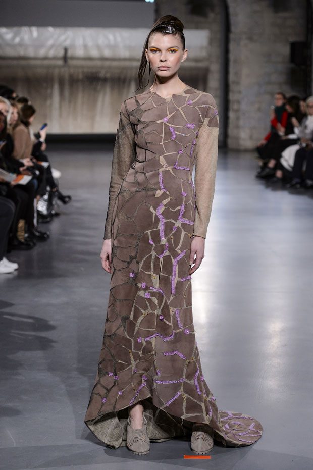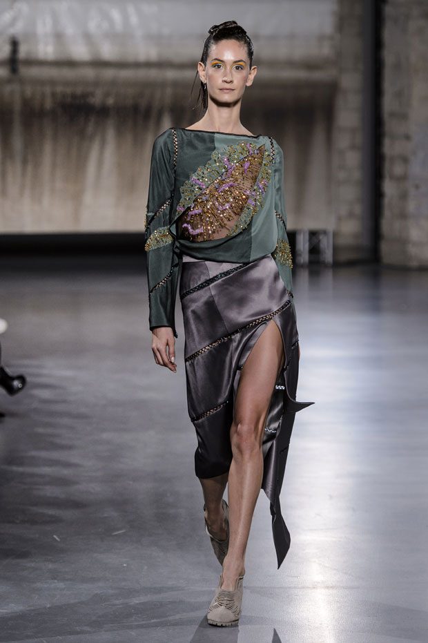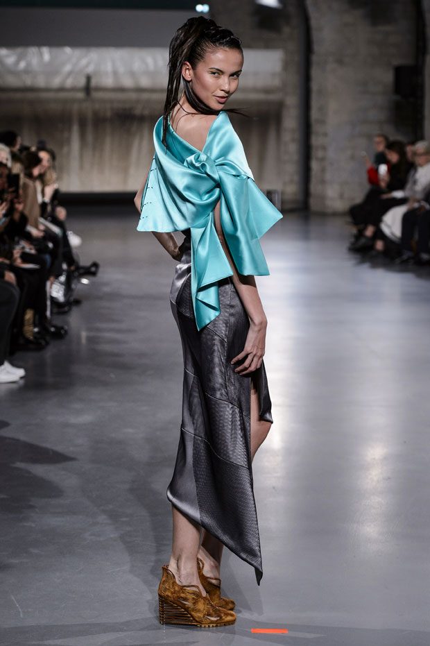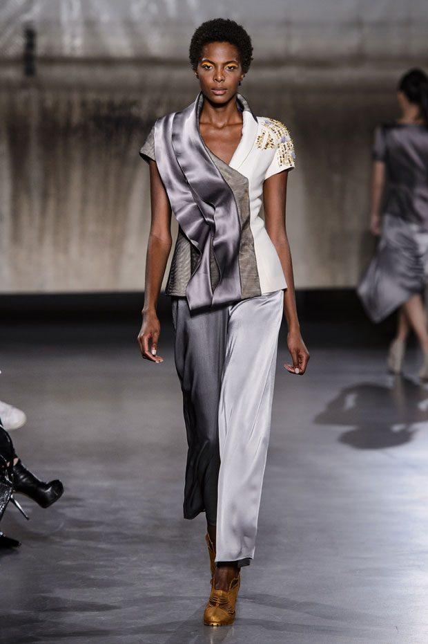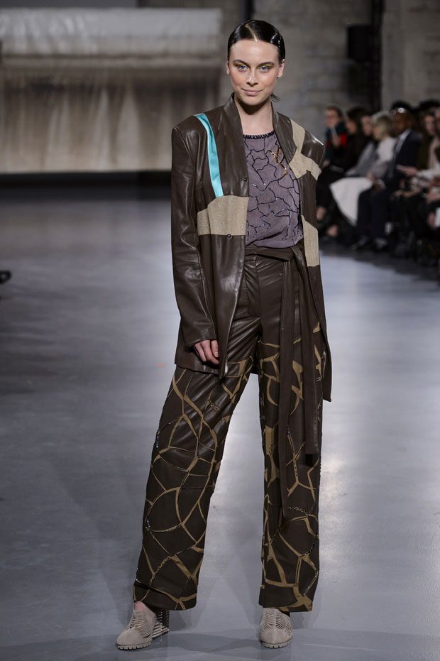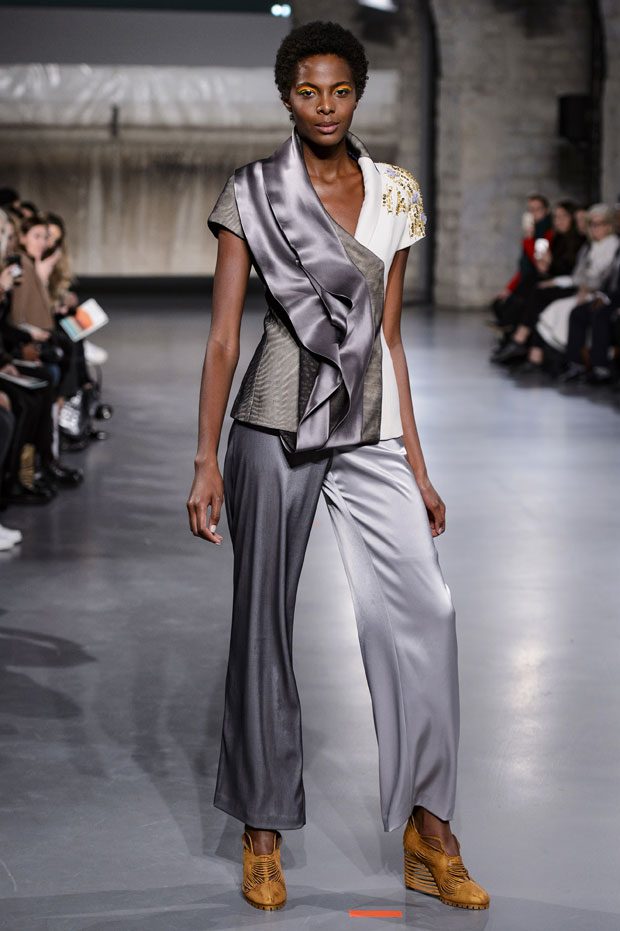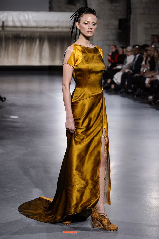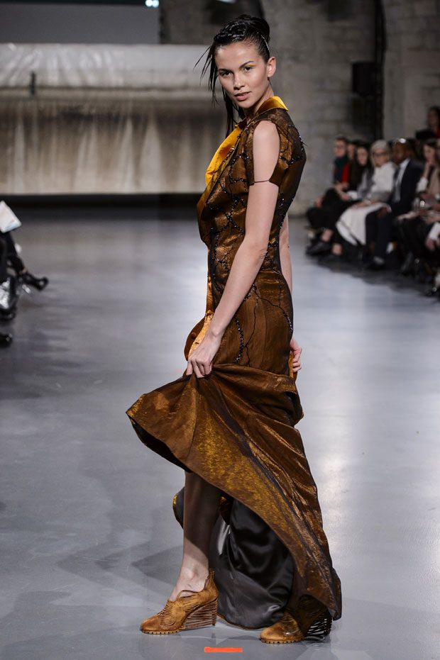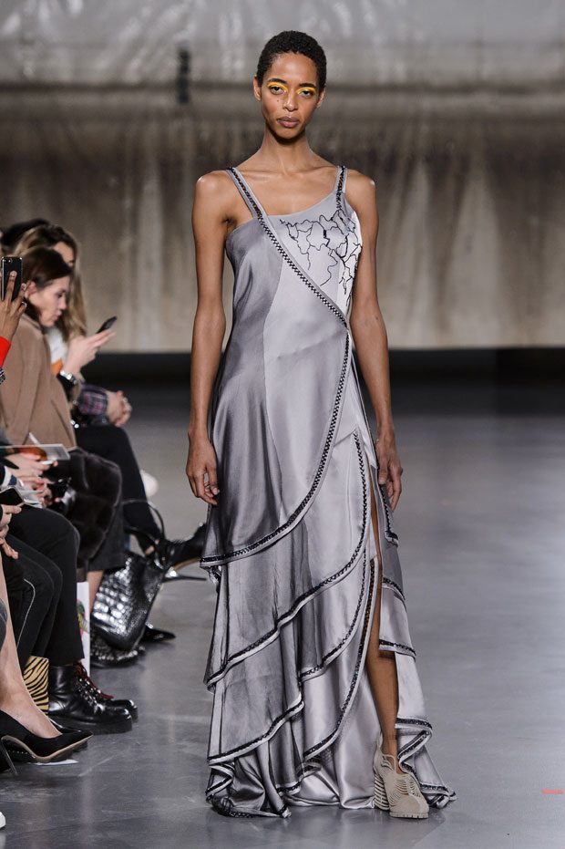 The warm hues of the desert dominate the spring-summer 2018 collection of the Montreal-based, Mexican-born designer. Images of scorched and cracked earth give way to the ripples of a heavy silk, evoking in their movements the changing waves of sand dunes. Guided by shifts in light and the slightest passing breeze, garments mutate and take on an ephemeral existence that lasts only until the next movement. The constant to and fro is framed by the passage of shadows of black silk tulle that envelop and consume the warm colors of the collection. A yellow jute, coarse and rough, juxtaposes the softness of a silk. The play of contrasts that characterizes Ortega’s work takes on its full meaning in a desert landscape; dark shadows bring freshness while a sparkling embroidery instantly reminds us of the glare of a blinding sun. Suddenly, a burst of bright color, like a desert flower springing up after the rain. From a distance, its contours are fuzzy, like a mirage, but closer, details become more precise. The glitter quickly disappears among the beige, yellow and golden surroundings, as the desert reclaims its rights. – from Antonio Ortega