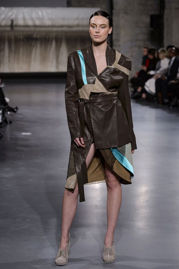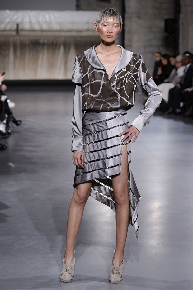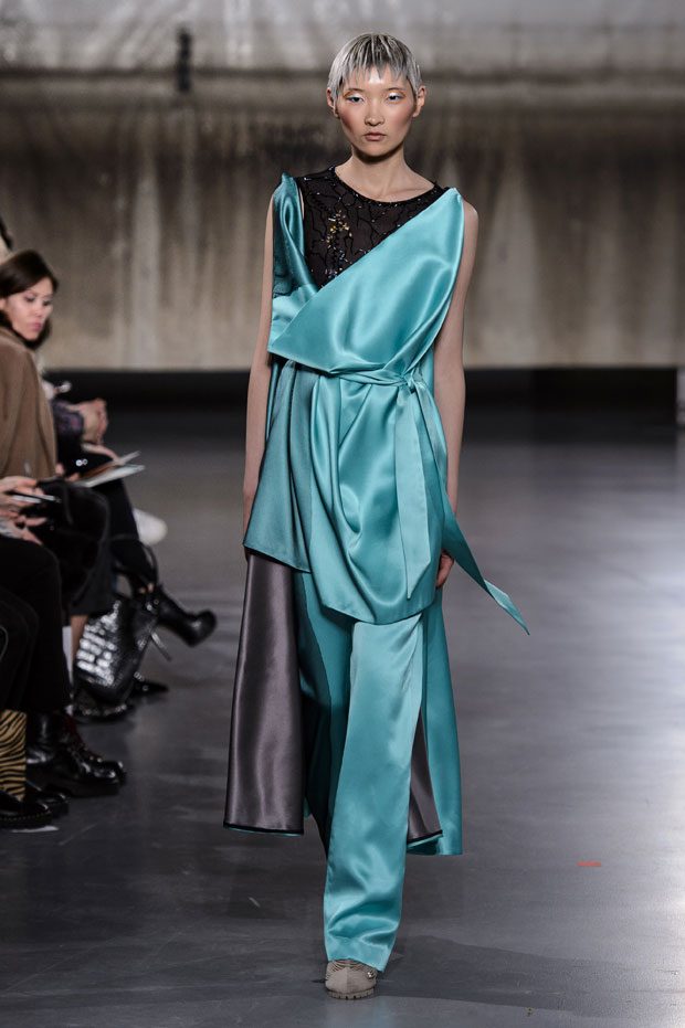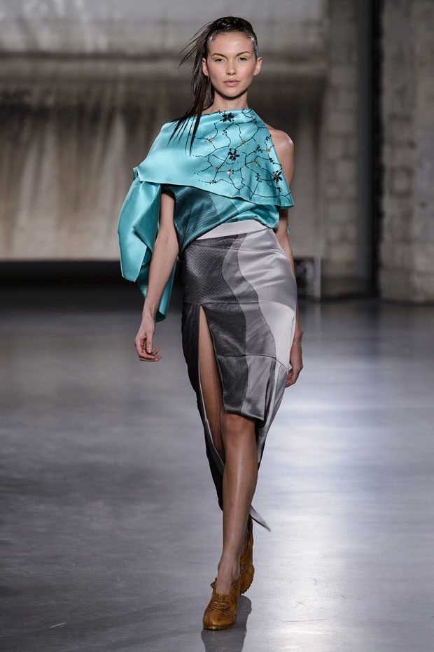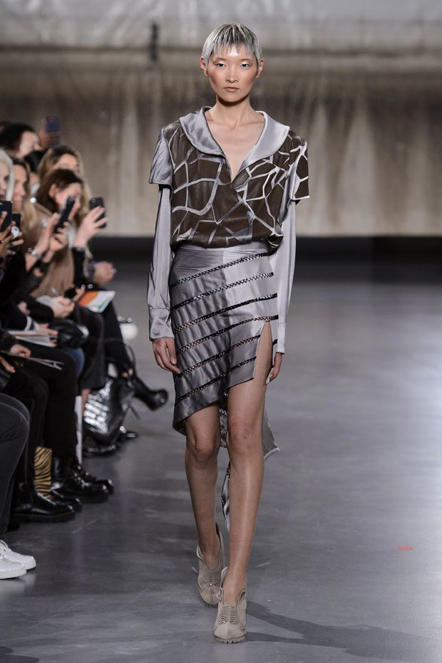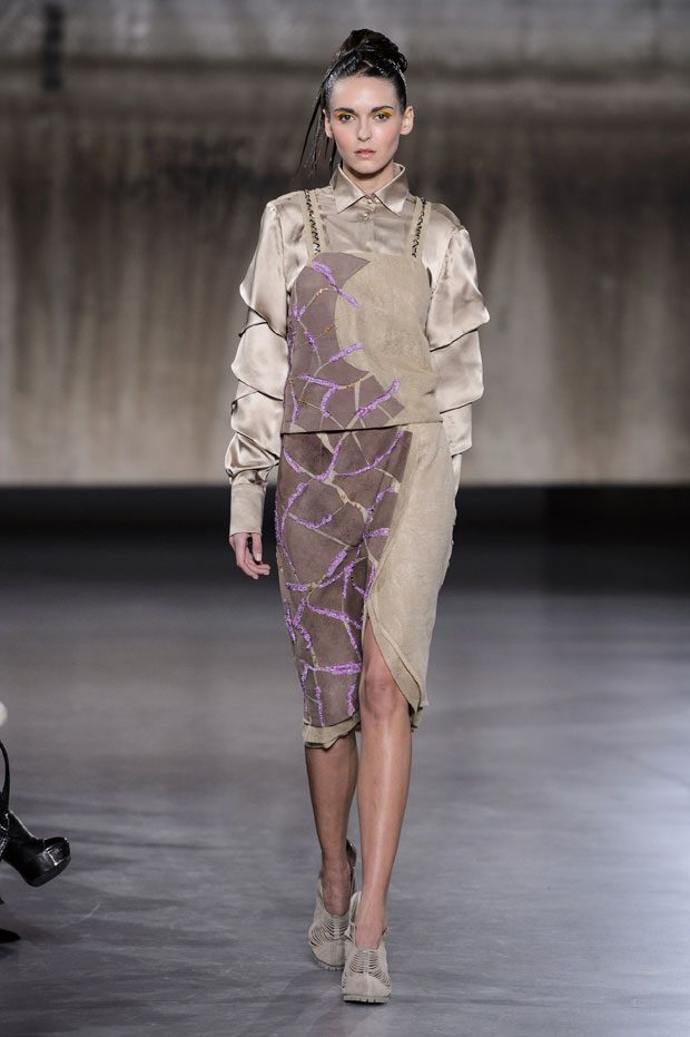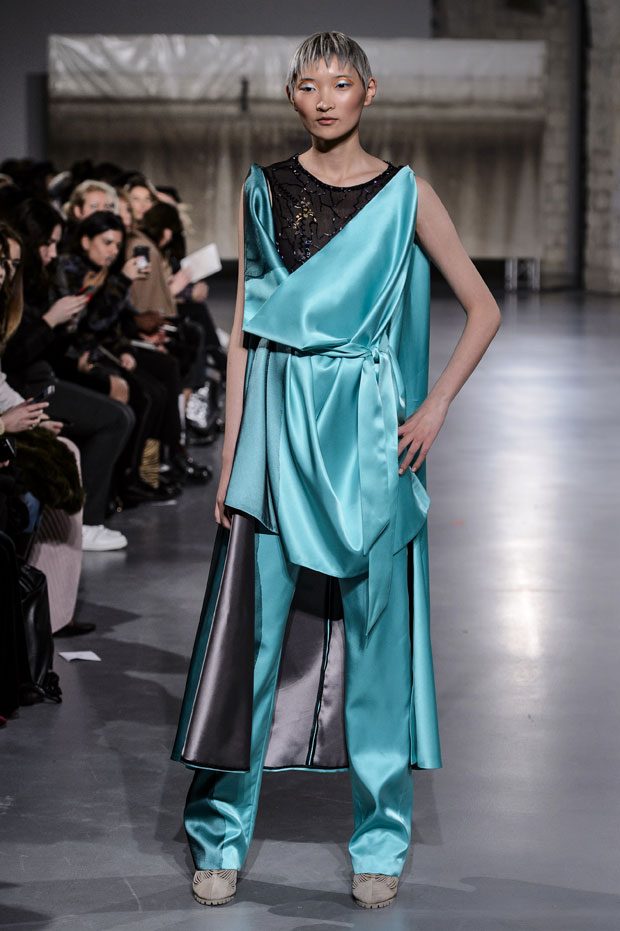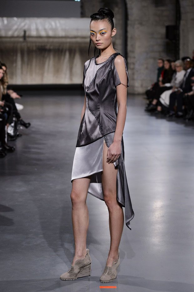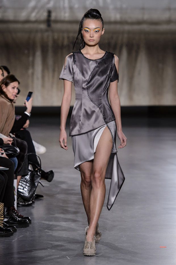 The warm hues of the desert dominate the spring-summer 2018 collection of the Montreal-based, Mexican-born designer. Images of scorched and cracked earth give way to the ripples of a heavy silk, evoking in their movements the changing waves of sand dunes. Guided by shifts in light and the slightest passing breeze, garments mutate and take on an ephemeral existence that lasts only until the next movement. The constant to and fro is framed by the passage of shadows of black silk tulle that envelop and consume the warm colors of the collection. A yellow jute, coarse and rough, juxtaposes the softness of a silk. The play of contrasts that characterizes Ortega’s work takes on its full meaning in a desert landscape; dark shadows bring freshness while a sparkling embroidery instantly reminds us of the glare of a blinding sun. Suddenly, a burst of bright color, like a desert flower springing up after the rain. From a distance, its contours are fuzzy, like a mirage, but closer, details become more precise. The glitter quickly disappears among the beige, yellow and golden surroundings, as the desert reclaims its rights. – from Antonio Ortega