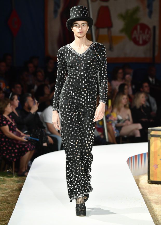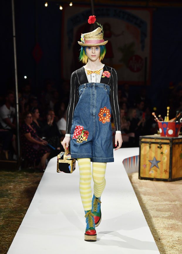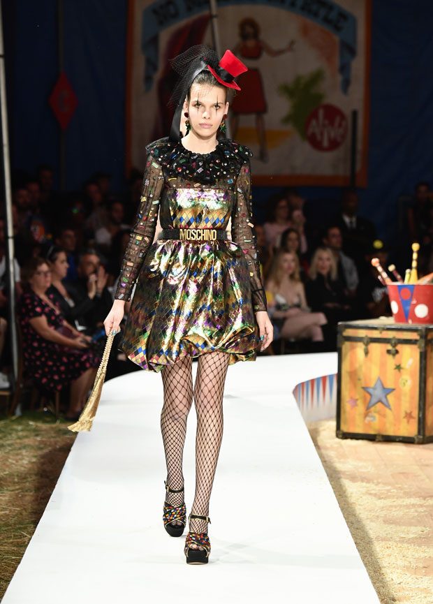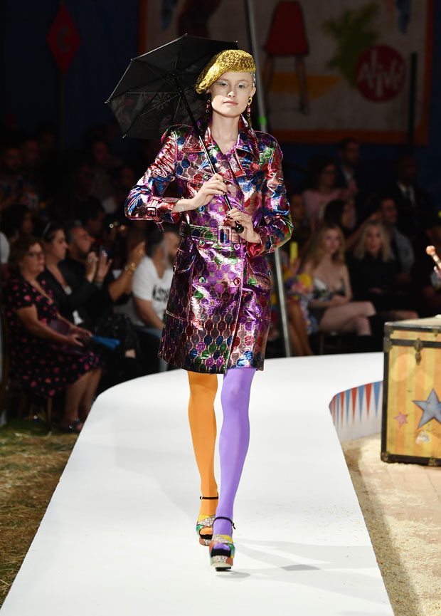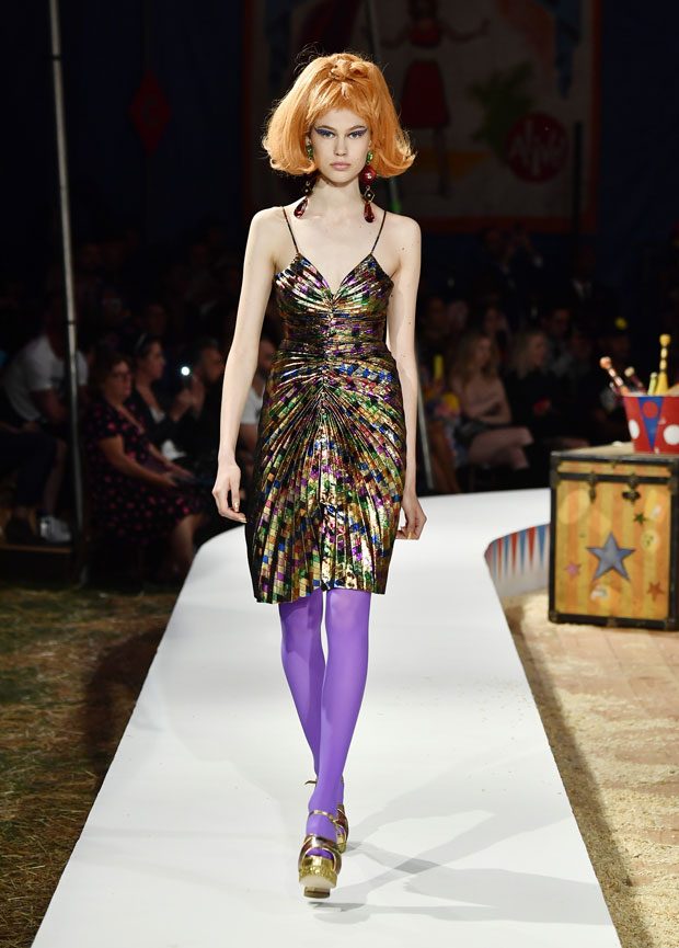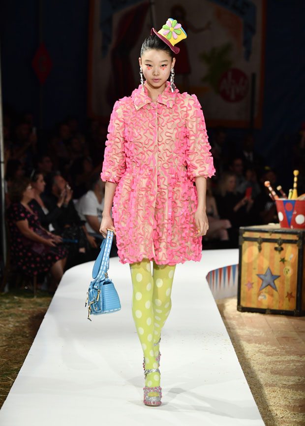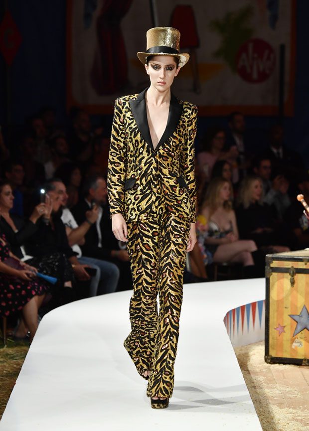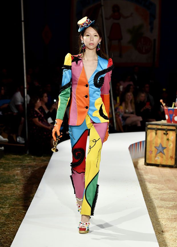 Ladies and Gentlemen! Boys and Girls! Children of all ages! Welcome to the most spectacular, most fascinating, most incredible… Mos[t]-chino Show! Trapeze artists, acrobats, popcorn, cotton candy, unicycles and clowns. Moschino’s Creative Director Jeremy Scott is reaching into the circus of today’s events and pulling a rabbit out of a hat – or rather, a tiger. This season is Moschino’s answer to the current state of affairs. From peony-pink ruched tulle dresses with giant multi-colored daisy appliques, to harlequin Lurex brocade suits, silk georgette gowns with floral appliques outlined in tiny crystals, tiny round paillettes mirrors dotting a floor-length black gown. The message is a cinematic bow to the accusations, the scandal, the “news” of today. Scott asks us to step into the Moschino house of mirrors with him as he breathes joy, levity and life into the uncertainty. – from Moschino
