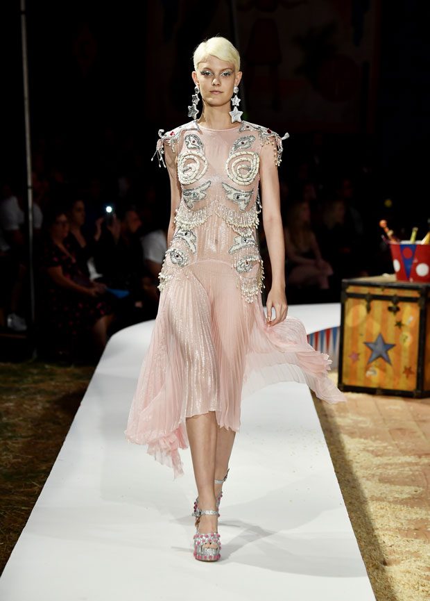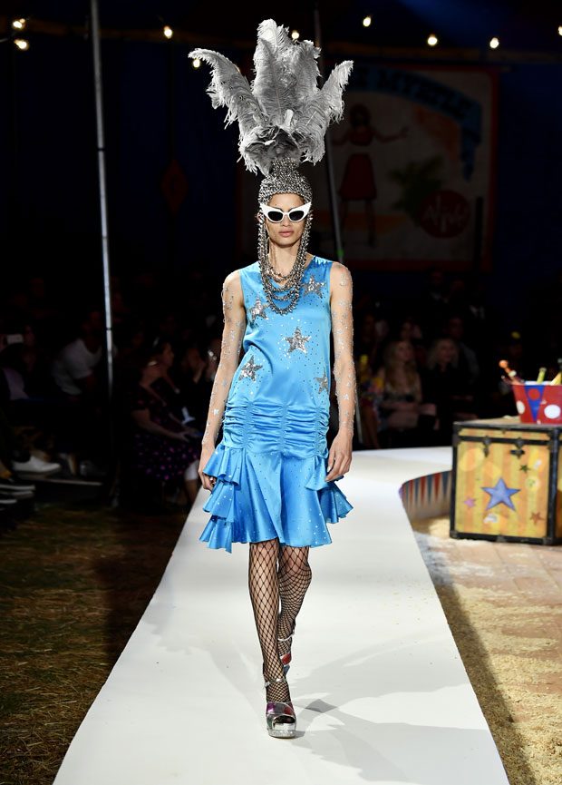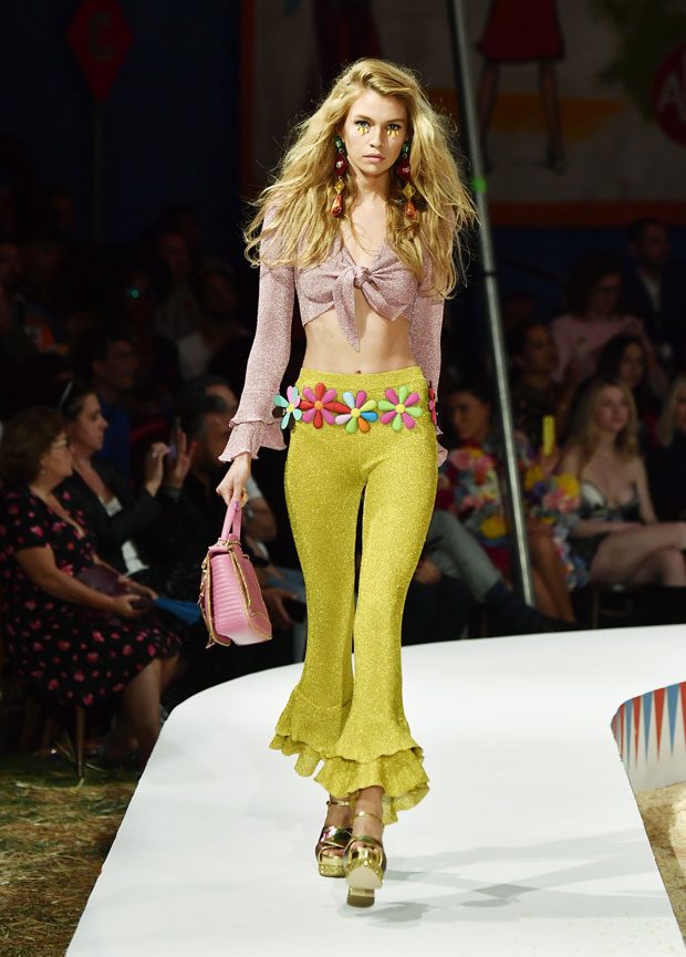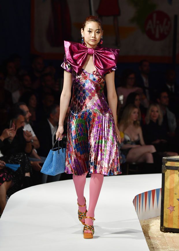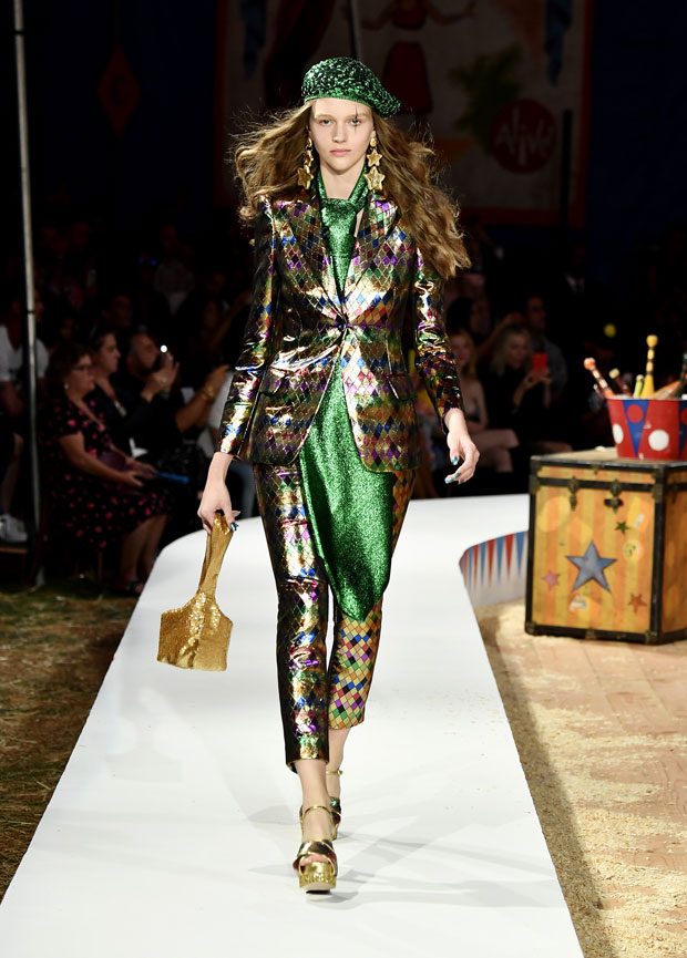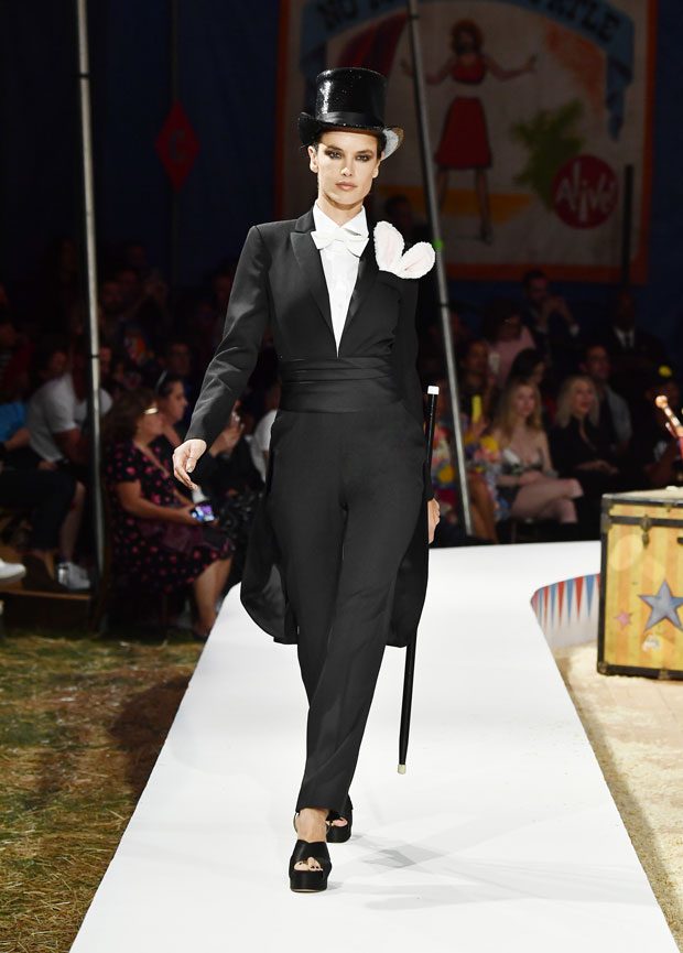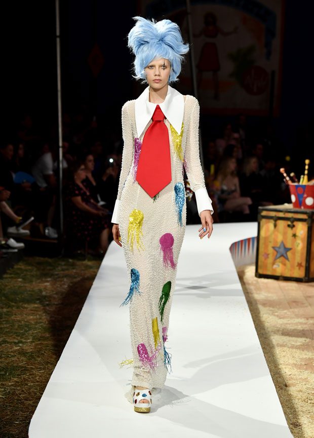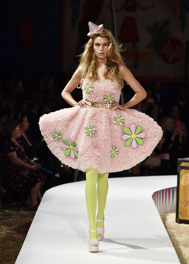 Ladies and Gentlemen! Boys and Girls! Children of all ages! Welcome to the most spectacular, most fascinating, most incredible… Mos[t]-chino Show! Trapeze artists, acrobats, popcorn, cotton candy, unicycles and clowns. Moschino’s Creative Director Jeremy Scott is reaching into the circus of today’s events and pulling a rabbit out of a hat – or rather, a tiger. This season is Moschino’s answer to the current state of affairs. From peony-pink ruched tulle dresses with giant multi-colored daisy appliques, to harlequin Lurex brocade suits, silk georgette gowns with floral appliques outlined in tiny crystals, tiny round paillettes mirrors dotting a floor-length black gown. The message is a cinematic bow to the accusations, the scandal, the “news” of today. Scott asks us to step into the Moschino house of mirrors with him as he breathes joy, levity and life into the uncertainty. – from Moschino