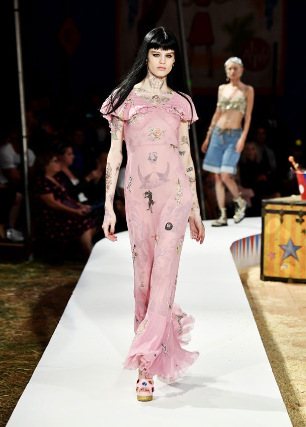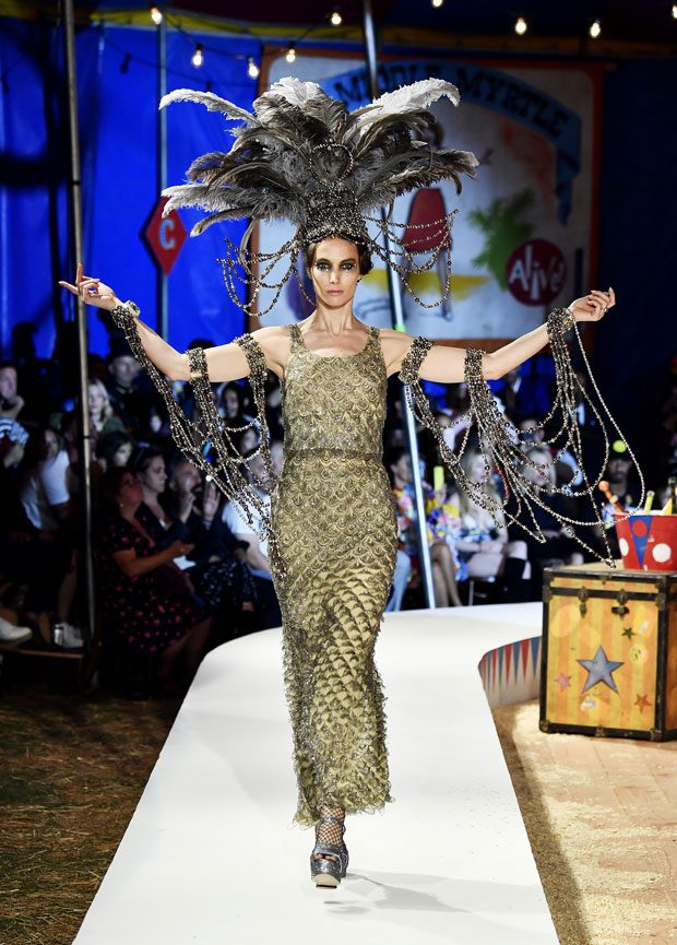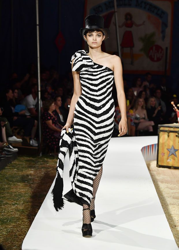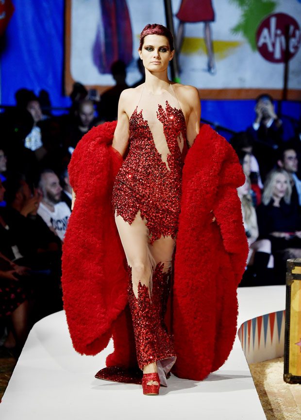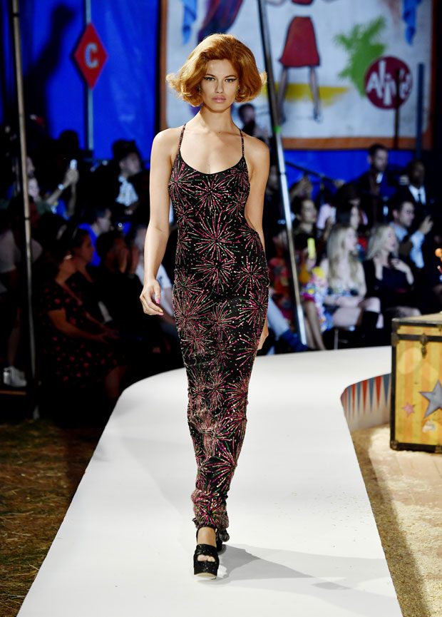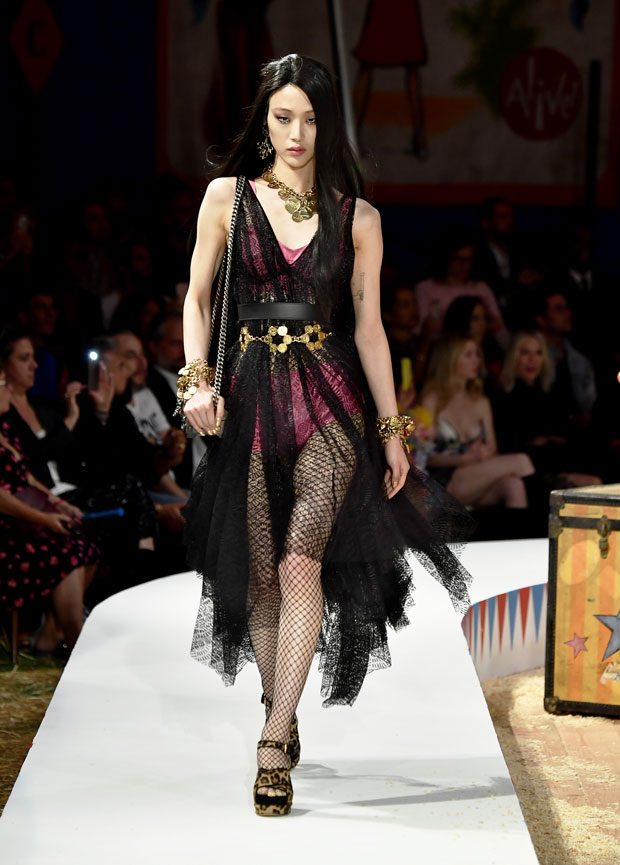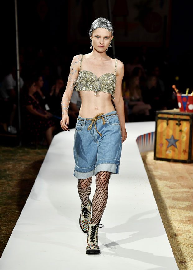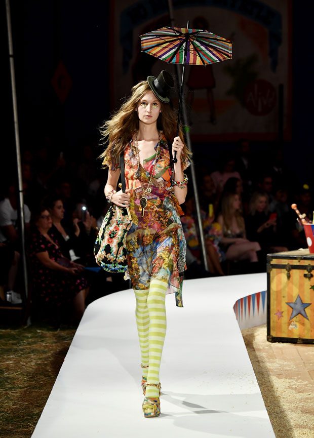 Ladies and Gentlemen! Boys and Girls! Children of all ages! Welcome to the most spectacular, most fascinating, most incredible… Mos[t]-chino Show! Trapeze artists, acrobats, popcorn, cotton candy, unicycles and clowns. Moschino’s Creative Director Jeremy Scott is reaching into the circus of today’s events and pulling a rabbit out of a hat – or rather, a tiger. This season is Moschino’s answer to the current state of affairs. From peony-pink ruched tulle dresses with giant multi-colored daisy appliques, to harlequin Lurex brocade suits, silk georgette gowns with floral appliques outlined in tiny crystals, tiny round paillettes mirrors dotting a floor-length black gown. The message is a cinematic bow to the accusations, the scandal, the “news” of today. Scott asks us to step into the Moschino house of mirrors with him as he breathes joy, levity and life into the uncertainty. – from Moschino