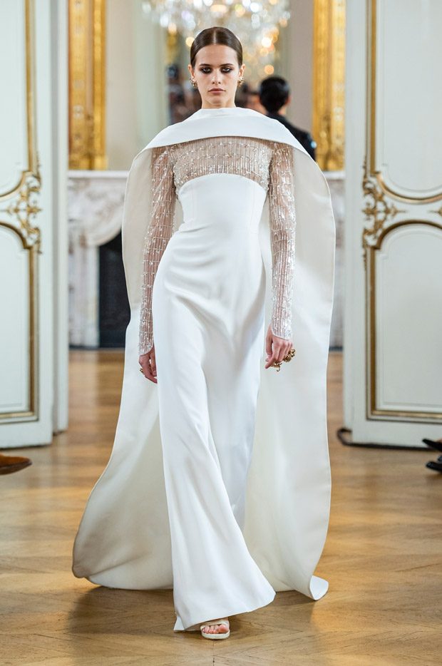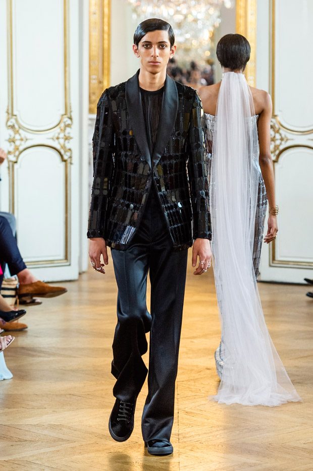 For fabrics, silk chiffon but also coupé organza with chenille embroidery, guipure lamé and gold liquid georgette, while powder pink vinyl sandals complete the look. The young Saudi model Taleedah Tamer acts as Muse for the winter collection from The House of Antonio Grimaldi, marking her first passes on the Parisian catwalks wearing the couturier’s creations. Another first, the debut of a mens collection, for a couture that looks beyond genders.”