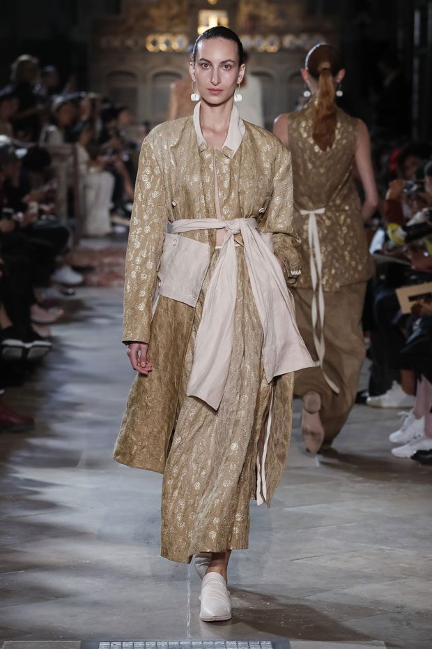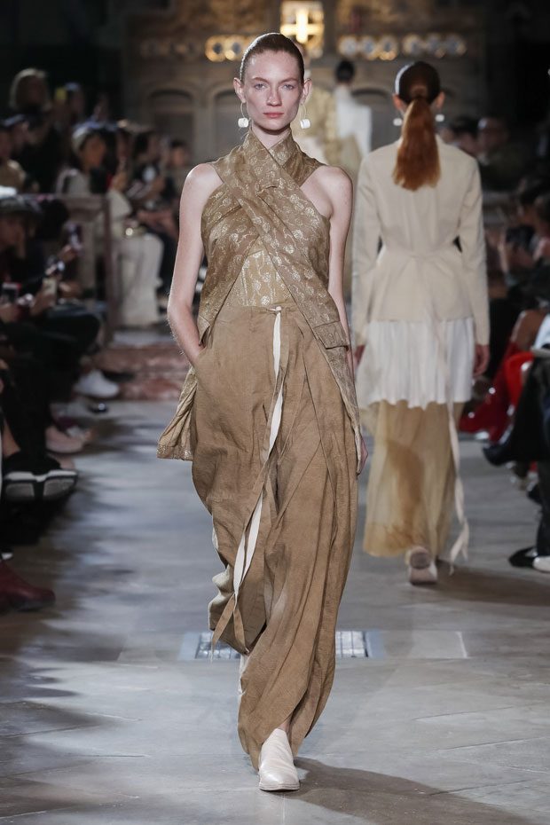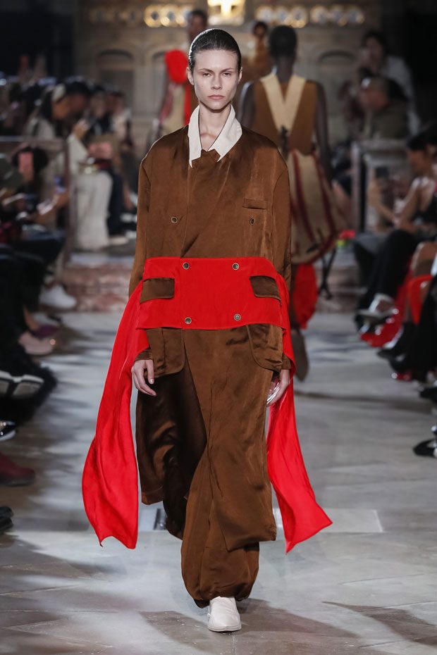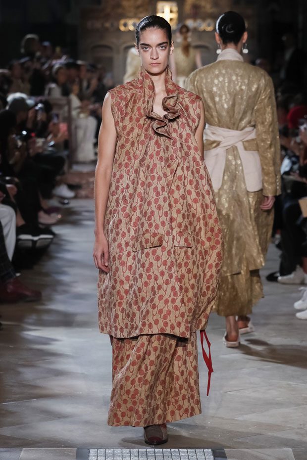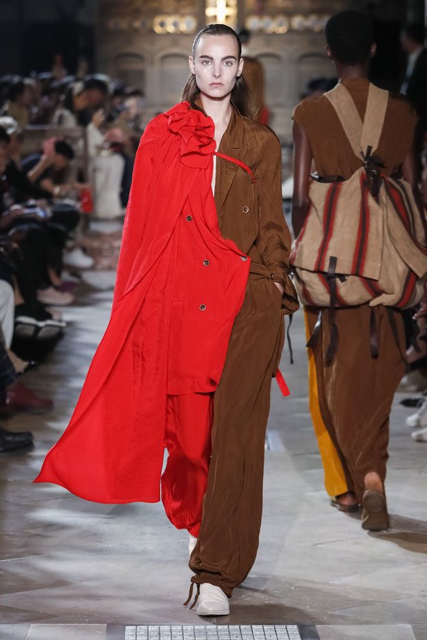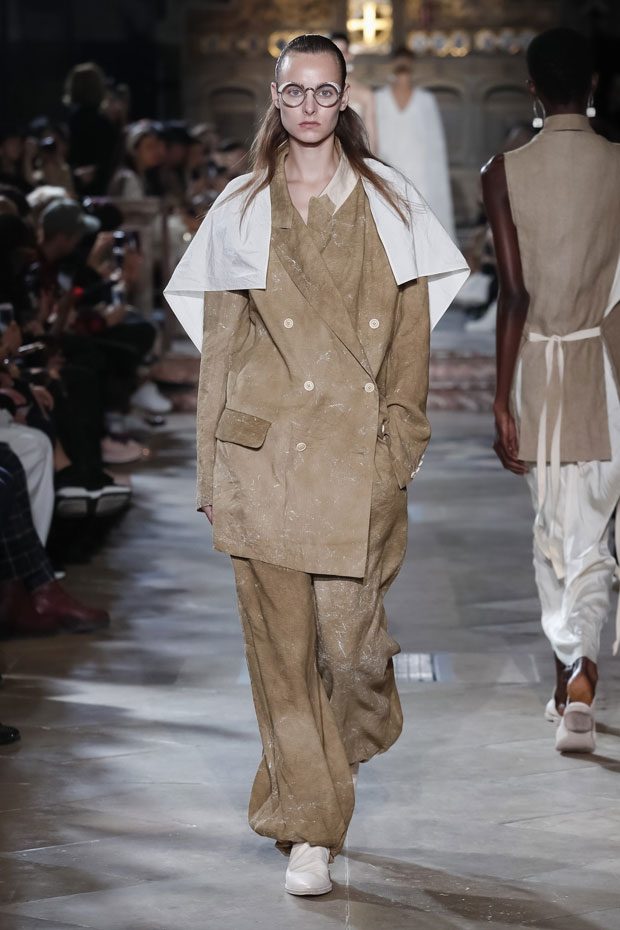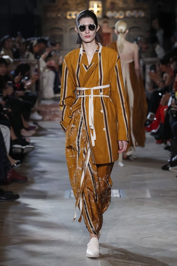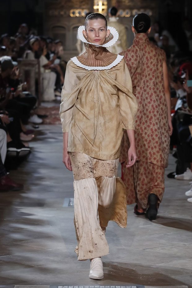 Uma Wang 2019 Spring Summer collection rises from the vision of a story set in an old colonial time to draw a colourful postcard with the moisture of the land and the heat of the air, that are slowly unfolding. A new force is twisted with the local vitality, and some flashback memories from far away are overlapping with a new reality. Under an hot and wet air, some beautiful illusions with a shape of pink flamingos and golden sun are taking life, mixing together the bitterness of coffee beans and the sourness of the berries. The rare shadow of a tree and the ruts left on the road after a short pouring rain give some rest to the dusty skin of faces soaking in sweat. The clothes are taking new shape to depict a restless Summer made of lights and shadows that hide new desires. – from Uma Wang