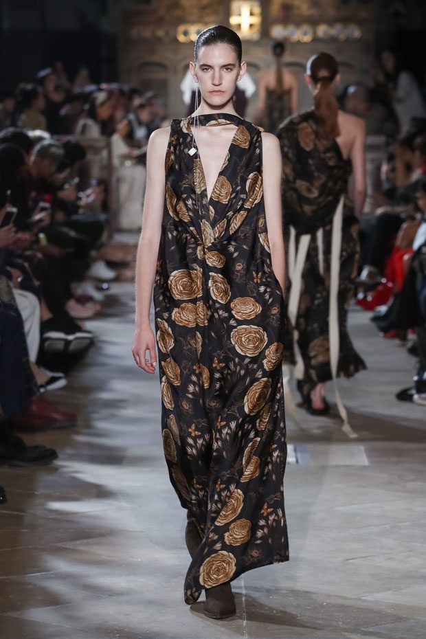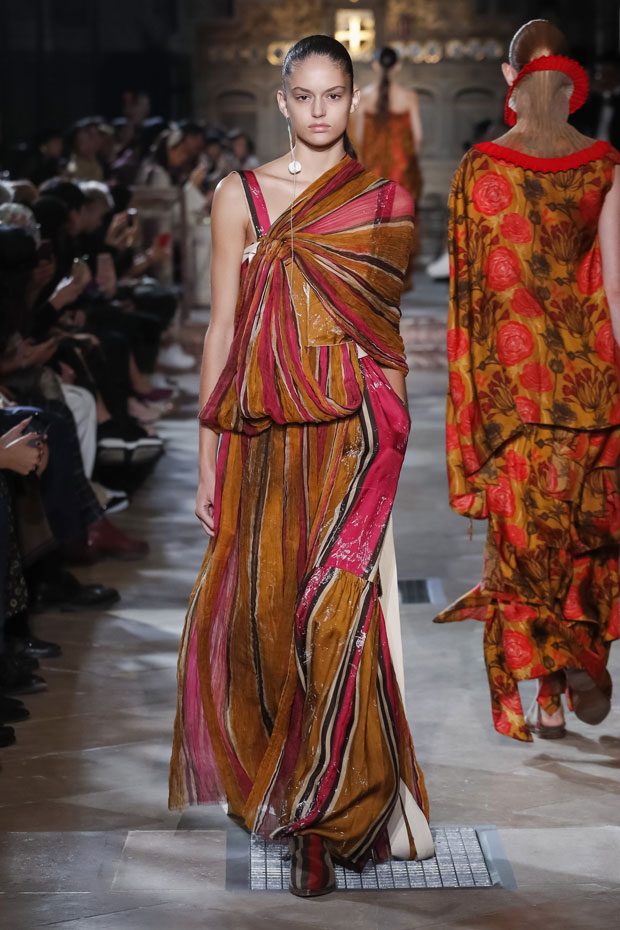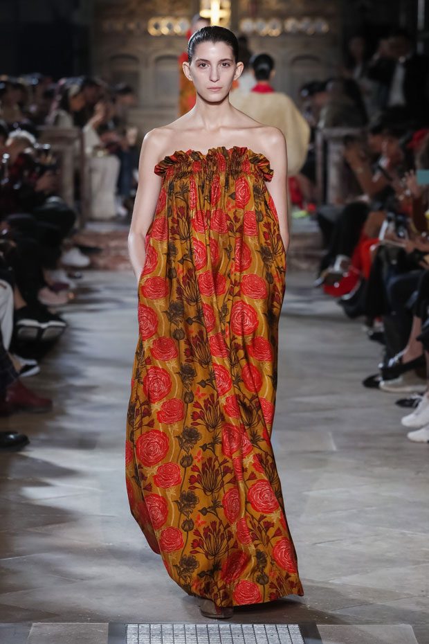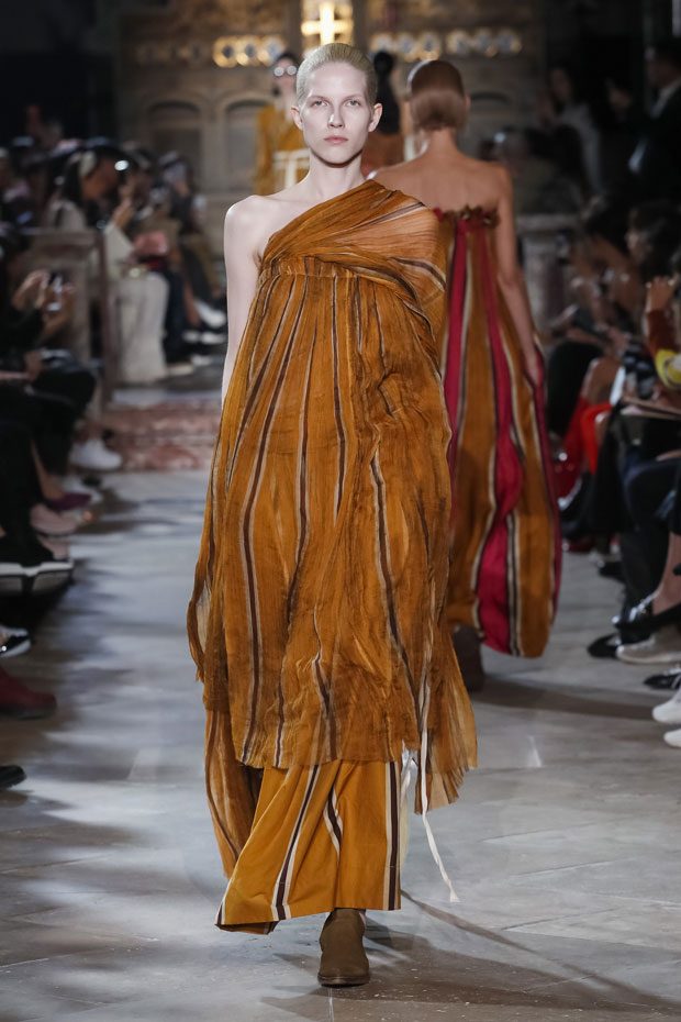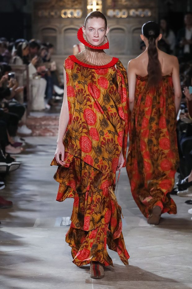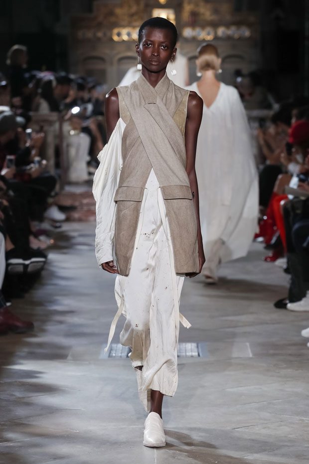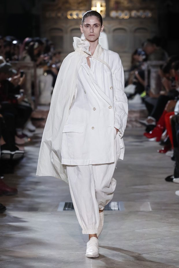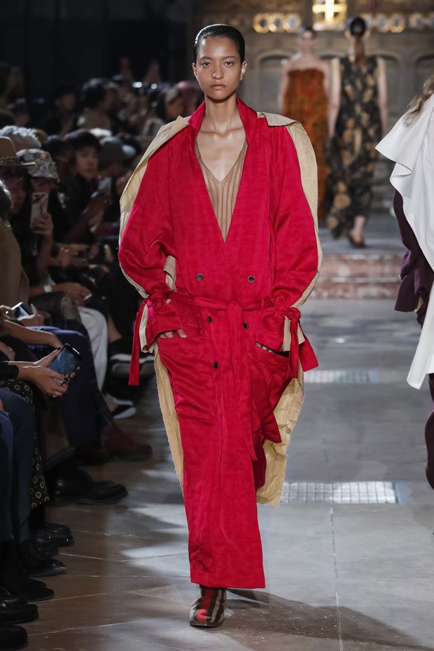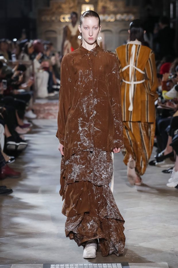 Uma Wang 2019 Spring Summer collection rises from the vision of a story set in an old colonial time to draw a colourful postcard with the moisture of the land and the heat of the air, that are slowly unfolding. A new force is twisted with the local vitality, and some flashback memories from far away are overlapping with a new reality. Under an hot and wet air, some beautiful illusions with a shape of pink flamingos and golden sun are taking life, mixing together the bitterness of coffee beans and the sourness of the berries. The rare shadow of a tree and the ruts left on the road after a short pouring rain give some rest to the dusty skin of faces soaking in sweat. The clothes are taking new shape to depict a restless Summer made of lights and shadows that hide new desires. – from Uma Wang